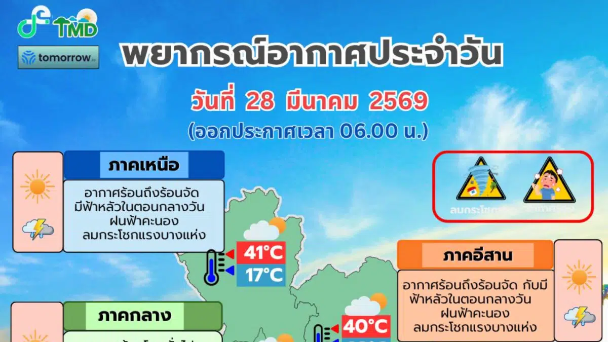 พยากรณ์อากาศของกรมอุตุฯ ออกประกาศเตือนอากาศช่วงวันที่ 28 มีนาคม -3 เมษายน 2569 สภาพอากาศร้อนถึงร้อนจัด เหนือและอีสานระวังฝนฟ้าคะนอง ลมแรง ลูกเห็บตก