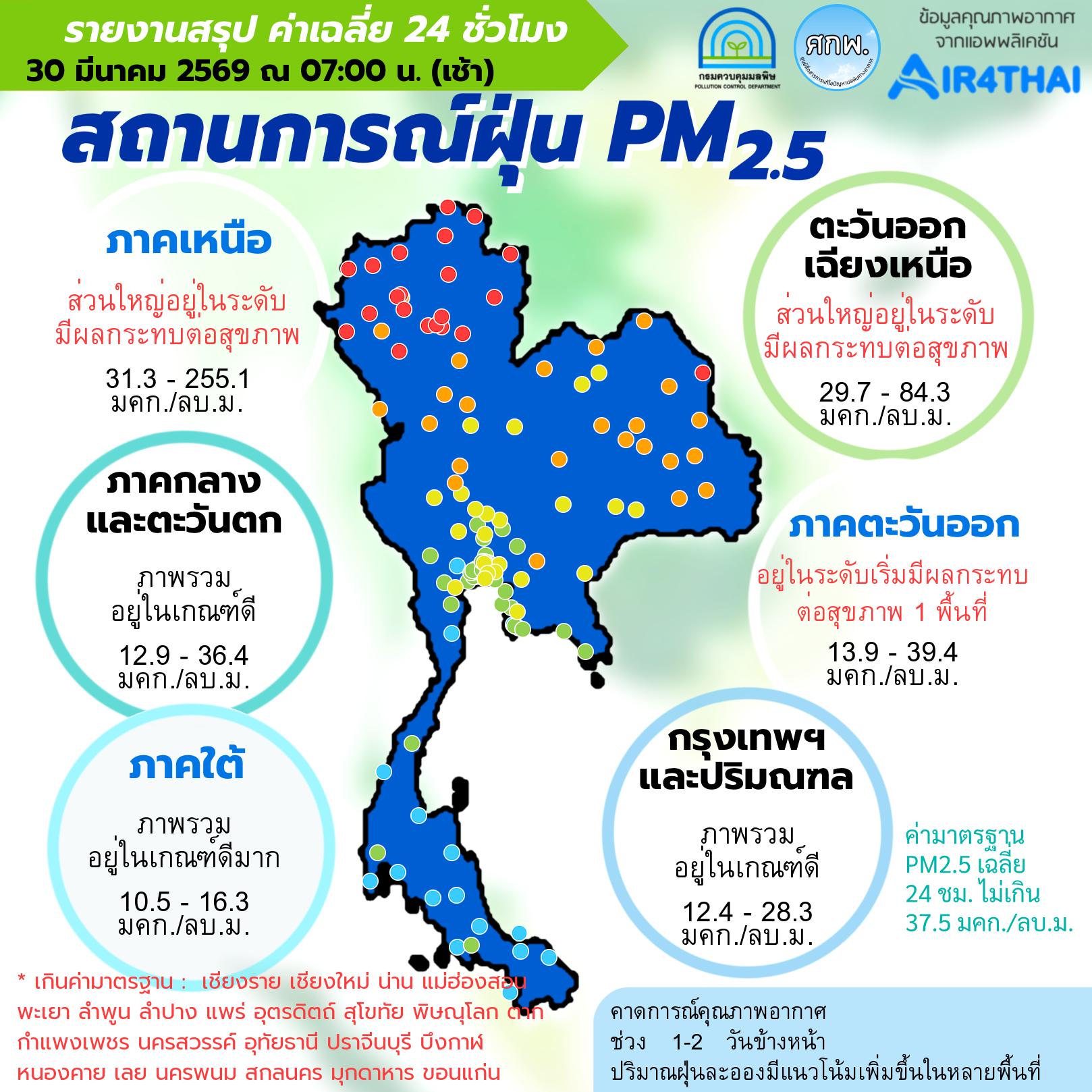 วันที่ 30 มี.ค. 2569 สถานการณ์มลพิษทางอากาศ โดยเฉพาะฝุ่น PM 2.5 ในประเทศไทยโซนภาคเหนือและภาคตะวันออกเฉียงเหนือ ยังคงน่าวิตกกังวล เว็บไซต์ IQAir ซึ่งเป็นเว็บไซต์รายงานคุณภาพอากาศหลายประเทศทั่วโลก รายงานสถานการณ์ฝุ่น PM2.5 เมืองที่มีมลพิษมากที่สุดในโลก แบบเรียลไทม์เมื่อเวลา 09.00 น. พบว่า