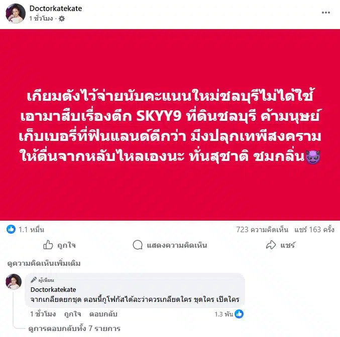 ล่าสุด (30 มี.ค.) หมอของขวัญ โพสต์ข้อความว่า “เกียมตังไว้จ่ายนับคะแนนใหม่ชลบุรีไม่ได้ใช้ เอามาสืบเรื่องตึก SKYY9 ที่ดินชลบุรี ค้ามนุษย์เก็บเบอรี่ที่ฟินแลนด์ดีกว่า มึงปลุกเทพีสงครามให้ตื่นจากหลับไหลเองนะ ทั่นสุชาติ ชมกลิ่น” พร้อมกับระบุข้อความอีกด้วยว่า “จากเกลียดยกชุด ตอนนี้กูโฟกัสได้ละว่าควรเกลียดใคร ขุดใคร เปิดใคร”