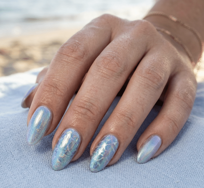 สไตล์เมอร์เมดหรือการขัดผงโฮโลแกรมกำลังได้รับความนิยมอย่างสูง เล็บที่ขัดผงมุก ผงกระจก ผงโฮโลแกรม จะมีความเหลือบวาว เมื่อมือของคุณเปียกน้ำ เล็บจะยิ่งดูเปล่งประกายคล้ายเกล็ดปลา หยดน้ำค้างบนใบไม้ สีพื้นยอดฮิตสำหรับการทำเล็บสไตล์นี้คือ สีฟ้าพาสเทล สีชมพูอ่อน สีใส การประดับด้วยอะไหล่รูปหอย ไข่มุกเม็ดเล็ก เพิ่มกลิ่นอายของทะเลได้เป็นอย่างดี
