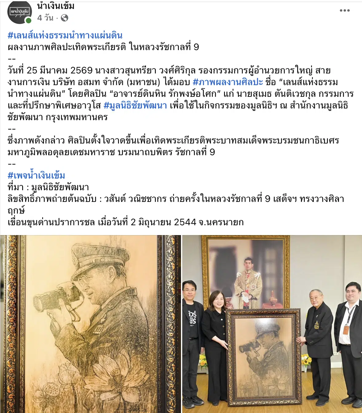 ศิลปินวาดภาพชื่อ อาจารย์ดินหิน รักพงษ์อโศก ตั้งใจวาดภาพนี้ขึ้นเพื่อเทิดพระเกียรติพระบาทสมเด็จพระบรมชนกาธิเบศร มหาภูมิพลอดุลยเดชมหาราช บรมนาถบพิตร รัชกาลที่ 9 จากนั้นเพจเฟซบุ๊กชื่อ น้ำเงินเข้ม นำภาพพิธีมอบผลงานดังกล่าวไปโพสต์ลงโซเชียลมีเดีย