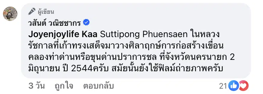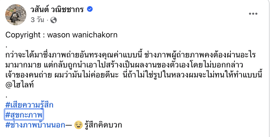 ต่อมาวันที่ 27 มีนาคม 2569 นายวสันต์ วณิชชากร ช่างภาพชื่อดัง แชร์โพสต์ของเพจน้ำเงินเข้มมายังเฟซบุ๊กส่วนตัว พร้อมพิมพ์ข้อความภาษาอังกฤษว่า Copyright : wason wanichakorn เพื่อแสดงสิทธิ์ว่าเขาคือเจ้าของภาพถ่ายต้นฉบับ