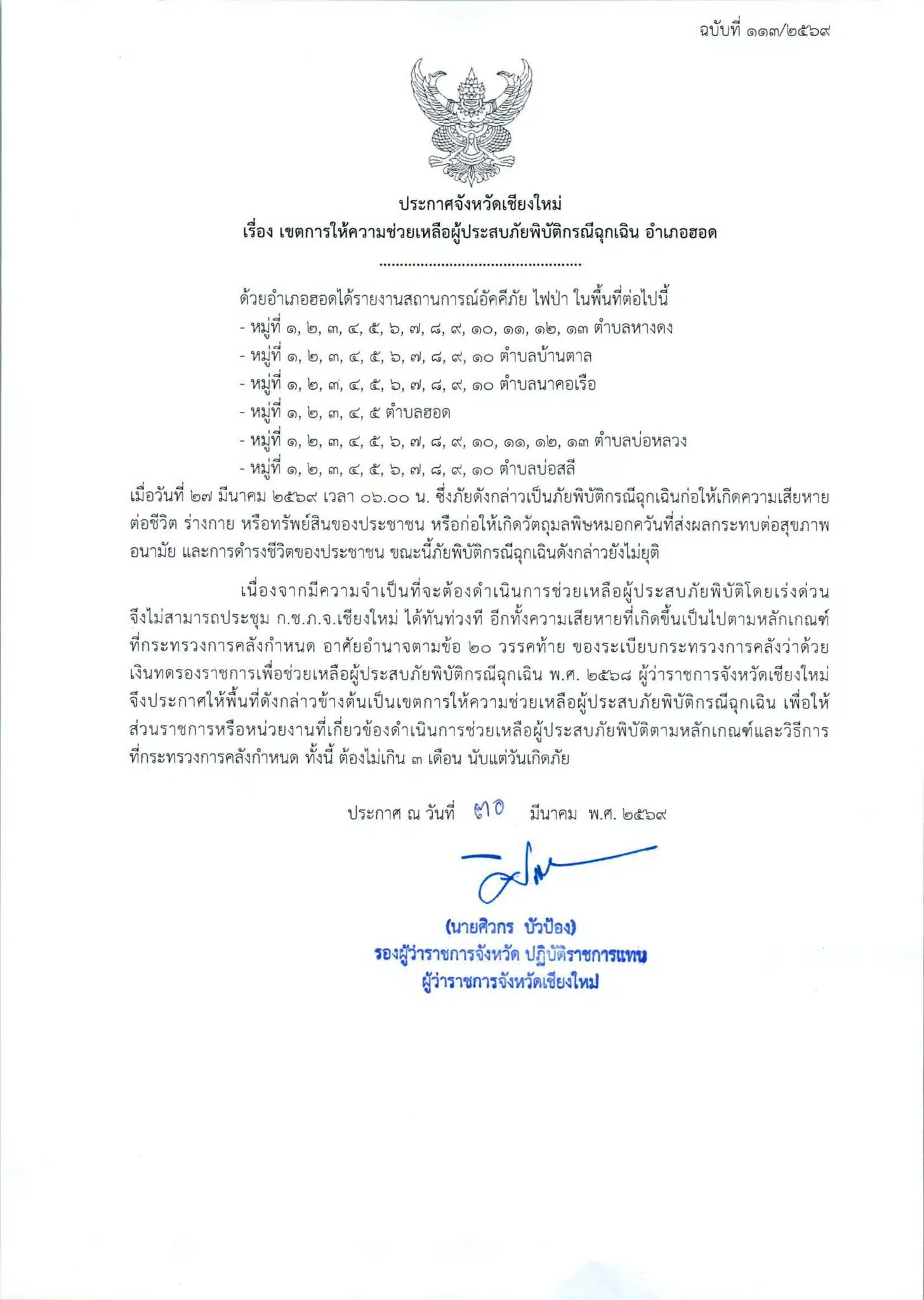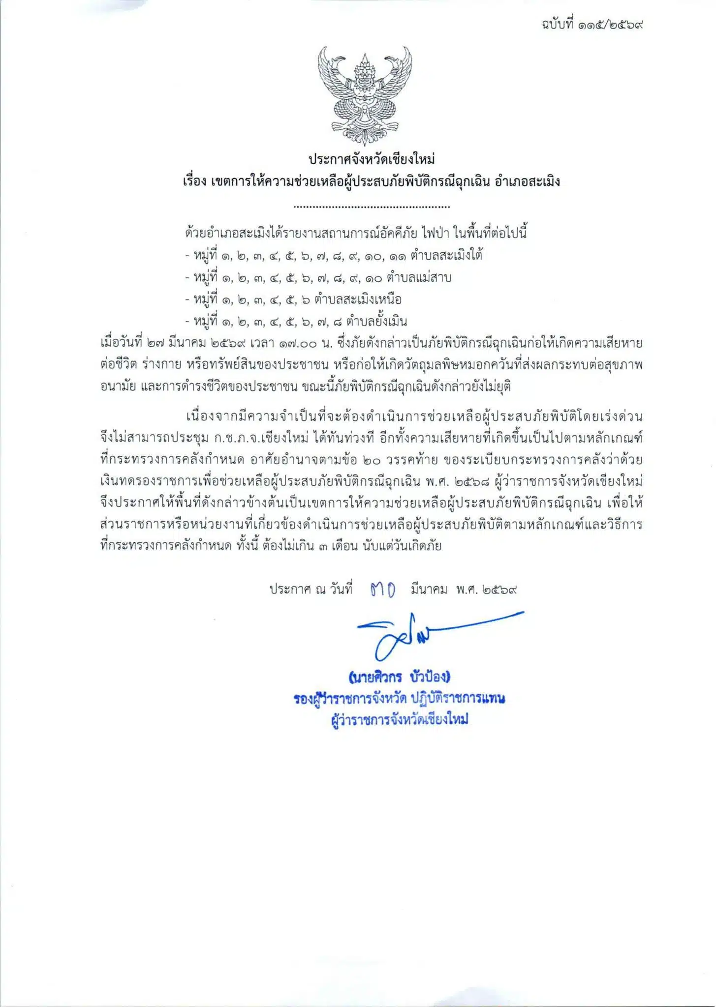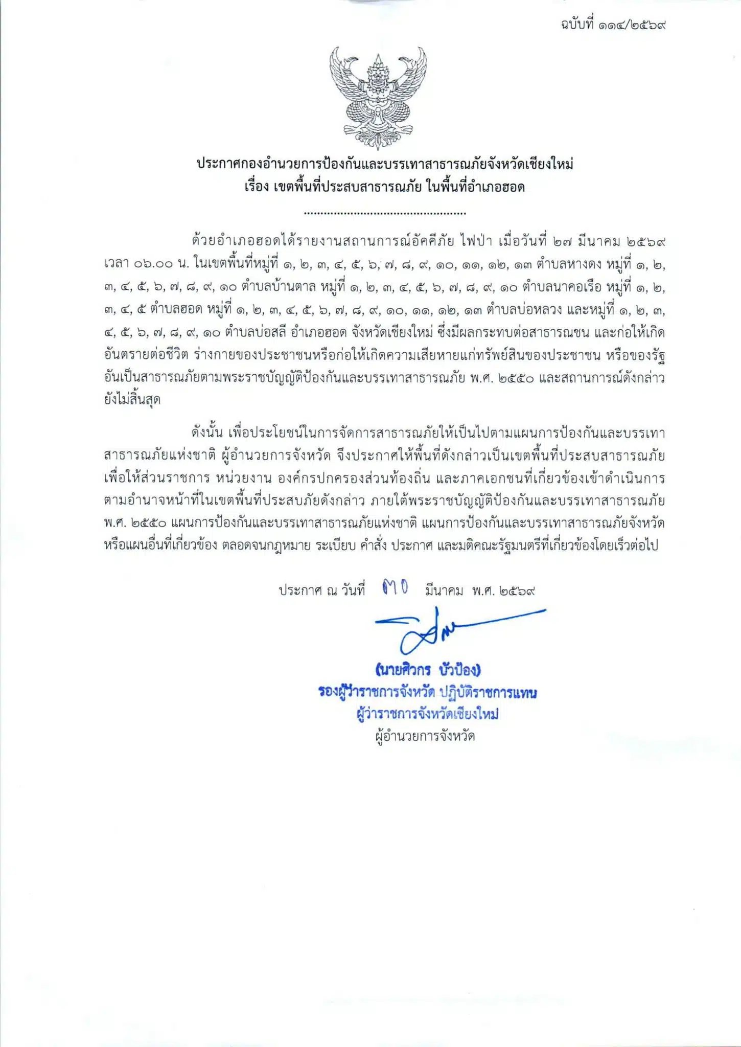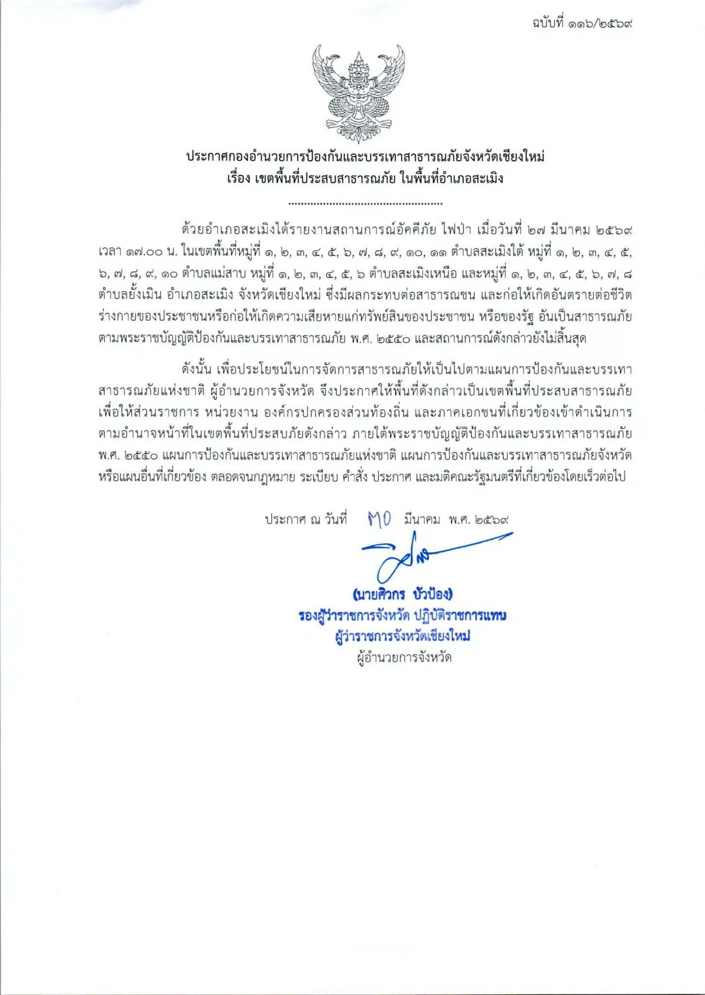 วันที่ 31 มี.ค. 2569 จังหวัดเชียงใหม่ และกองอำนวยการป้องกันและบรรเทาสาธารณภัยจังหวัดเชียงใหม่ ได้ประกาศเขตพื้นที่ประสบสาธารณภัย และประกาศเขตการให้ความช่วยเหลือผู้ประสบภัยพิบัติกรณีฉุกเฉิน (อัคคีภัย ไฟป่า) ในพื้นที่ อ.สะเมิง และ อ.ฮอด โดยนายศิวกร บัวป้อง รองผู้ว่าราชการจังหวัด ปฏิบัติราชการแทนผู้ว่าราชการจังหวัดเชียงใหม่ ลงนามประกาศดังกล่าว ระบุว่า