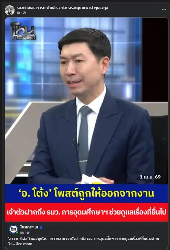 รศ.พ.ต.ท.ดร.กฤษณพงค์ พูตระกูล (อ.โต้ง) โพสต์เฟซบุ๊ก คืนวันที่ 31 มี.ค.69 ระบุ มหาวิทยาลัยมีคำสั่งให้ออกมีผลทันที ชาวเน็ตแห่ให้กำลังใจ จี้ กระทรวง อว. ตอบคำถามธรรมาภิบาล