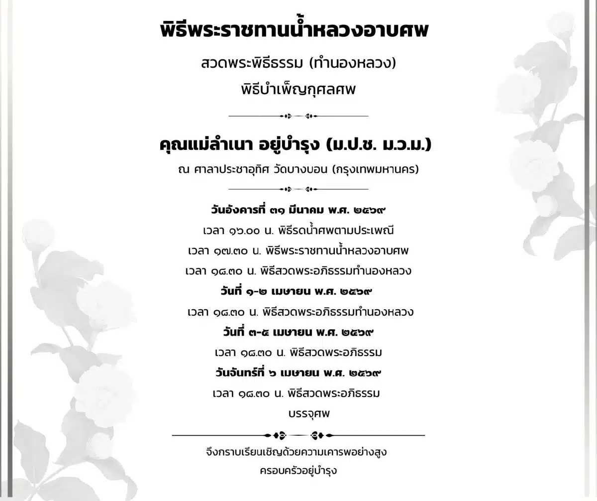 กำหนดการพิธีพระราชทานน้ำหลวงอาบศพ สวดพระอภิธรรม (ทำนองหลวง) “คุณแม่ลำเนา อยู่บำรุง” (ม.ป.ช. ม.ว.ม.) ณ ศาลาประชาอุทิศ วัดบางบอน กทม.