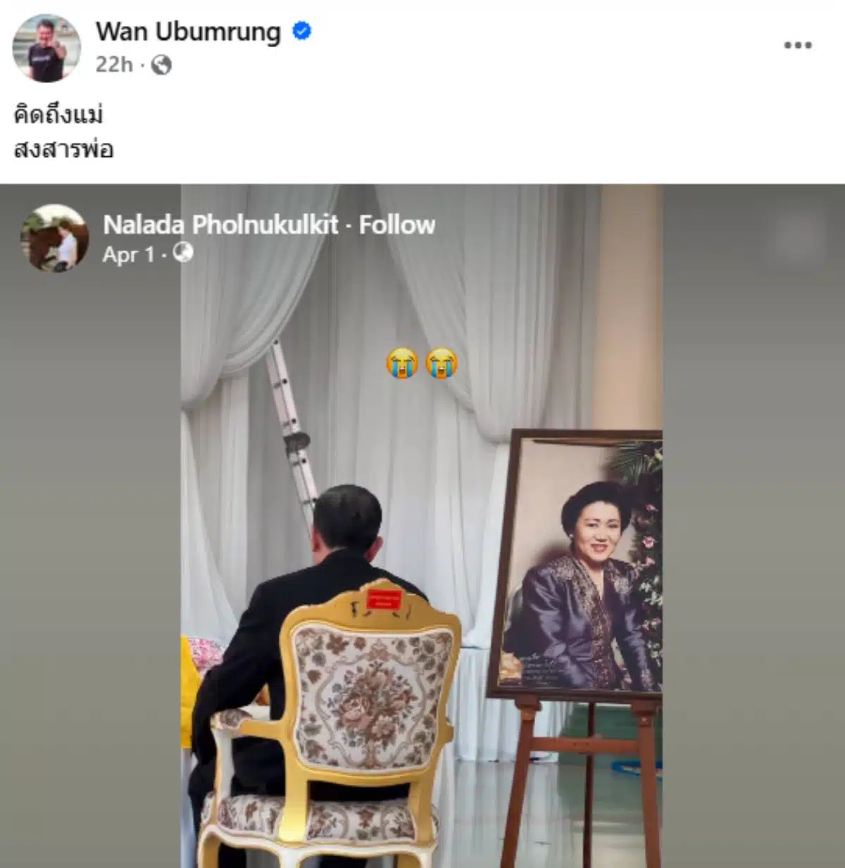 ทั้งนี้เฟซบุ๊ก Nalada Pholnukulkit แฟนสาวของ “วัน อยู่บำรุง” โพสต์คลิปเศร้า “เฉลิม อยู่บำรุง” นั่งอาลัย มองร่างของภรรยา ผู้ล่วงลับ ขณะที่ลูกชายได้แชร์คลิปดังกล่าว พร้อมเขียนข้อความว่า “คิดถึงแม่ สงสารพ่อ”