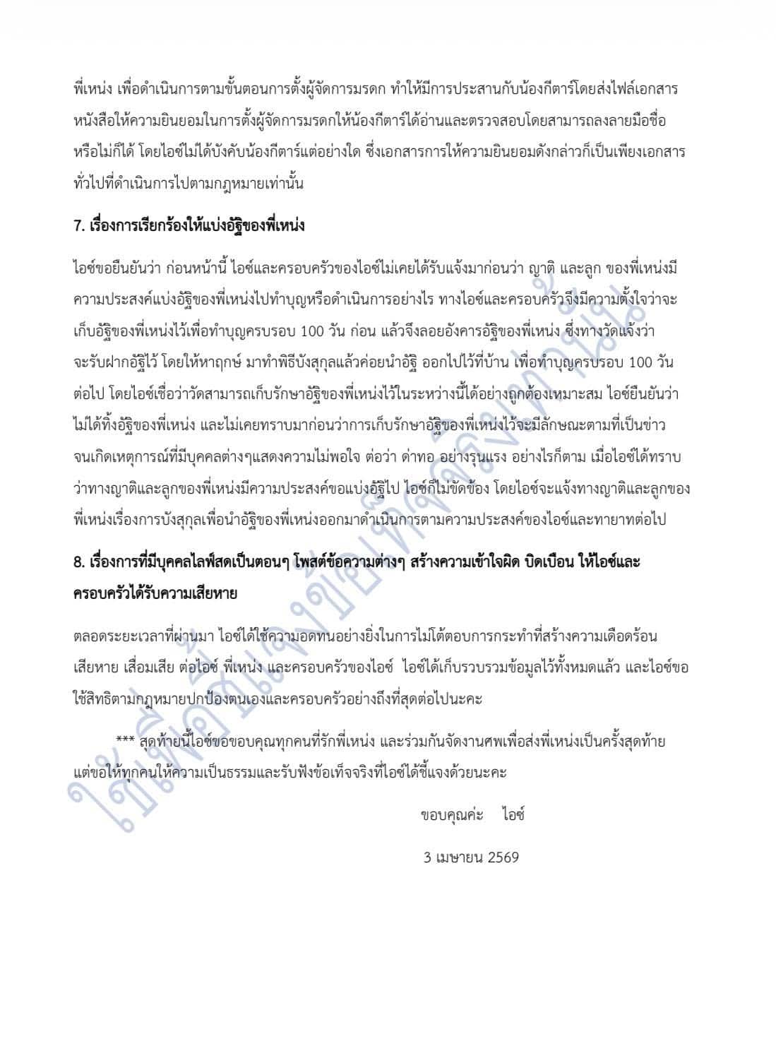 เนื่องจากพี่เหน่งมีภาระหนี้สินเรื่องบ้านและรถยนต์ที่ต้องมีการผ่อนชำระต่อไป การตั้งผู้จัดการมรดกของพี่เหน่งก็เพื่อเคลียร์ภาระหนี้สินเป็นหลัก ไม่ใช่การทำเพื่อให้ไอซ์ได้มรดกของพี่เหน่งคนเดียว ไอซ์ทราบดีว่าถึงไอซ์จะเป็นภรรยาและจดทะเบียนสมรส แต่พี่เหน่งก็มีลูก ไอซ์ไม่เคยปฏิเสธสิทธิของใครในการรับมรดกของพี่เหน่ง เพื่อดำเนินการตามขั้นตอนการตั้งผู้จัดการมรดก ทำให้มีการประสานกับน้องกีตาร์โดยส่งไฟล์เอกสารหนังสือให้ความยินยอมในการตั้งผู้จัดการมรดกให้น้องกีตาร์ได้อ่านและตรวจสอบโดยสามารถลงลายมือชื่อหรือไม่ก็ได้ โดยไอซ์ไม่ได้บังคับน้องกีตาร์แต่อย่างใด ซึ่งเอกสารการให้ความยินยอมดังกล่าวก็เป็นเพียงเอกสารทั่วไปที่ดำเนินการไปตามกฎหมายเท่านั้น