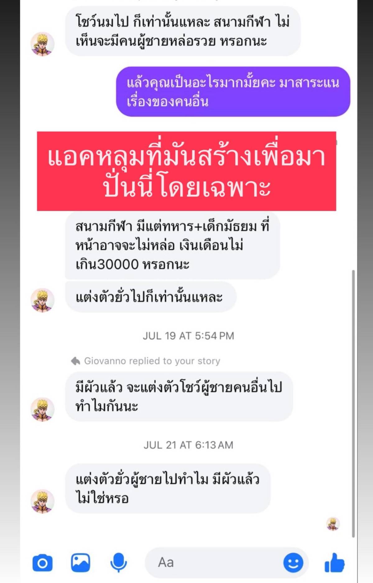 พอกัญบล็อกเฟซหลักเขาไป เรื่องก็ยังไม่จบค่ะ เขาสร้างแอคเคาท์หลุมขึ้นมาใหม่เพื่อตามมารังควานโดยเฉพาะ ส่งข้อความ “Toxic” มาหาเรื่อยๆ ทั้งคำพูดที่ไร้มารยาทและคุกคามทางเพศอย่างน่าเกลียด เช่น ทำไมนมใหญ่จัง, มีผัวแล้วจะแต่งตัวยั่วผู้ชายไปทำไม หรือ แต่งตัวยั่วไปก็เท่านั้น ตามหลักฐานที่กัญแนบไว้เลยค่ะ ตอนนั้นกัญพยายามปล่อยผ่านเพราะไม่อยากให้ค่ากับคนแบบนี้