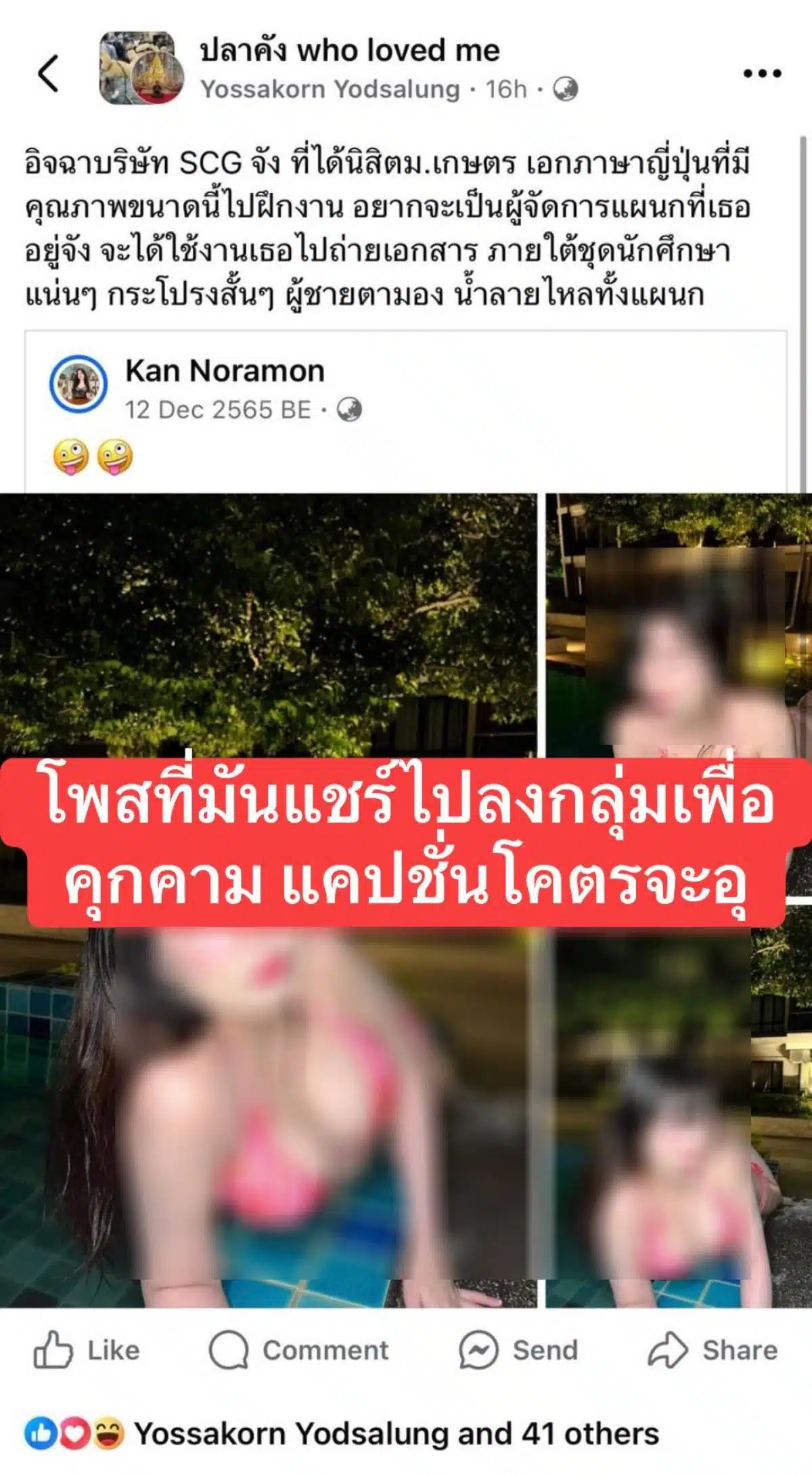 แต่ความประสาทเสียของเขามันไม่หยุดแค่นั้น เพราะเขายังแชร์รูปกัญไปลงกลุ่มซ้ำแล้วซ้ำเล่า จนช่วงนั้นมีคนแปลกหน้าแอดเฟซบุ๊กกัญมาเยอะผิดปกติ สร้างความรำคาญใจและทำให้รู้สึกไม่ปลอดภัยอย่างมาก ถึงแม้เหตุการณ์นี้จะเกิดขึ้นเมื่อปีที่แล้ว