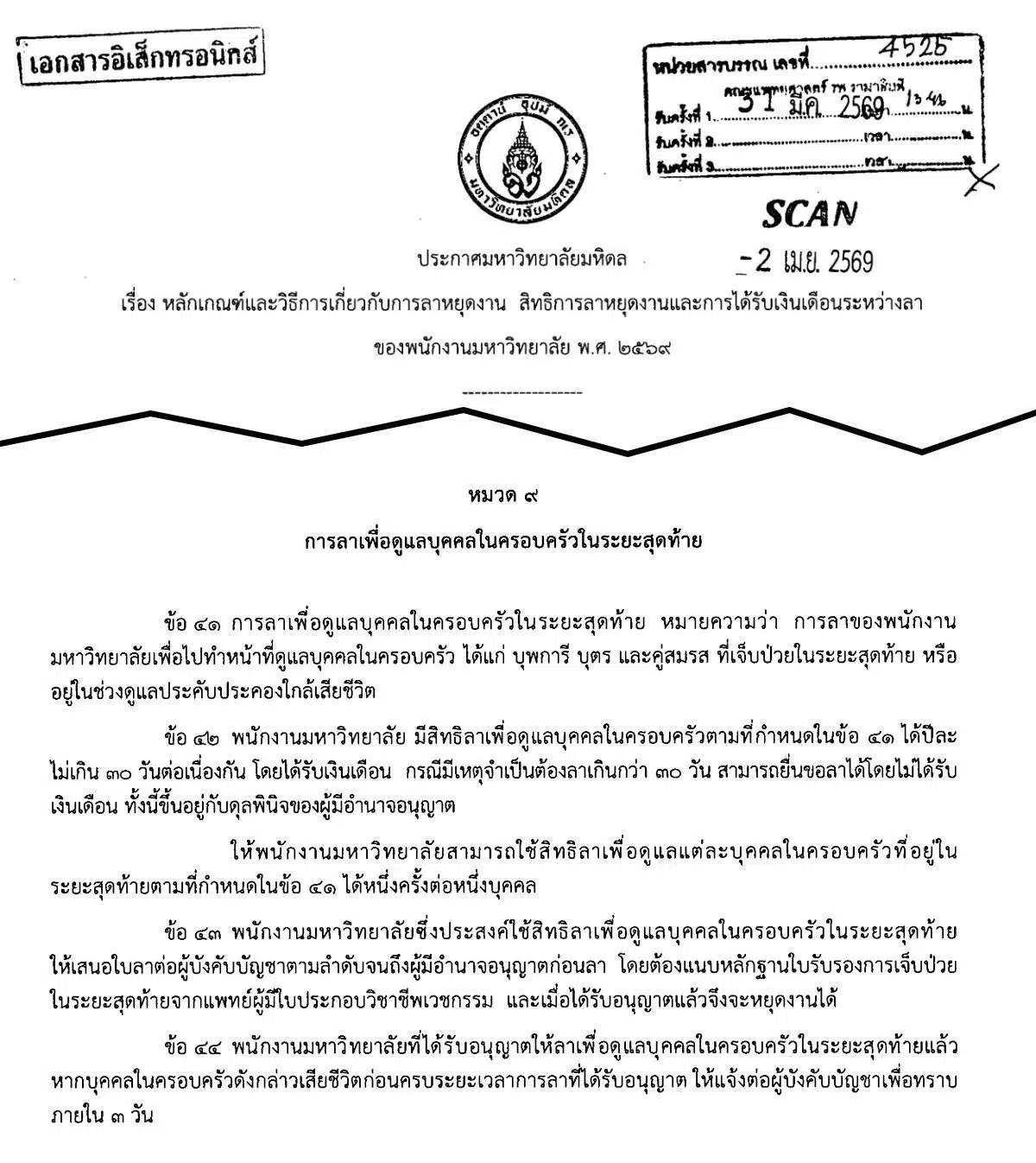 มหาวิทยาลัยมหิดลออกประกาศเรื่องหลักเกณฑ์วิธีการเกี่ยวกับการลาหยุดงานของพนักงานมหาวิทยาลัย พ.ศ. 2569 ผู้คนจำนวนมากชื่นชมสาระสำคัญในหมวด 9 ว่าด้วยการลาเพื่อดูแลบุคคลในครอบครัวในระยะสุดท้าย