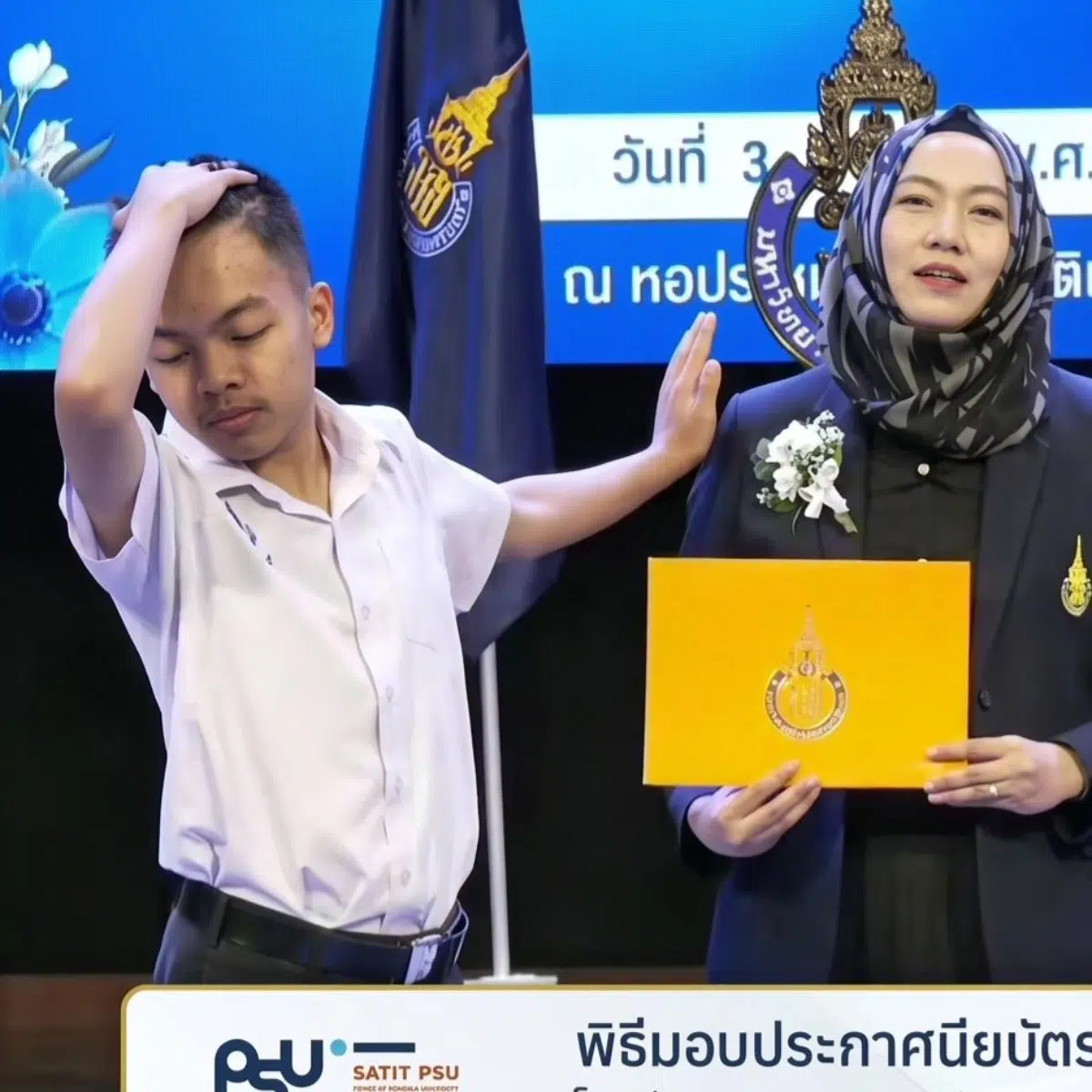 กลายเป็นไวรัลที่สร้างรอยยิ้มไปทั่วโลกโซเชียลทั้งในและต่างประเทศ สำหรับบรรยากาศพิธีมอบประกาศนียบัตรของนักเรียนโรงเรียนสาธิตมหาวิทยาลัยสงขลานครินทร์ (สาธิต ม.อ.) ที่เปลี่ยนภาพจำอันเข้มงวดของพิธีการเดิม ๆ ให้กลายเป็นเวทีแสดงออกถึงตัวตนและความผูกพันระหว่างครูกับศิษย์
