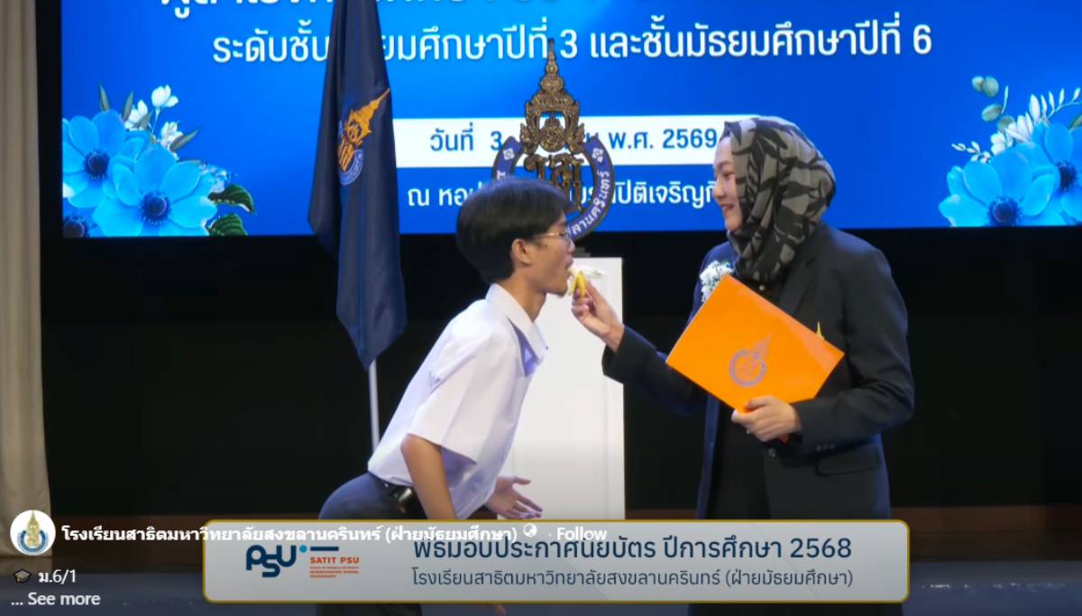 โดยเมื่อวันที่ 4 เม.ย.69 ที่ผ่านมา โรงเรียนสาธิตมหาวิทยาลัยสงขลานครินทร์ (ฝ่ายมัธยมศึกษา) โพสต์คลิปวิดีโอของบรรยากาศแห่งวันชื่นคืนสุขของลูกศิษย์จำนวนมาก ซึ่งนร.แต่ละคนได้รับอนุญาตให้แสดงท่าทางท่าโพสอะไรก็ได้ตามสไตล์ของตัวเองก่อนรับใบประกาศนียบัตร ซึ่งมีตั้งแต่ท่าเต้นสุดกวน ท่ามีมจากโซเชียล ไปจนถึงท่าทางสุดสร้างสรรค์ที่เรียกเสียงฮาได้สนั่นหอประชุม
