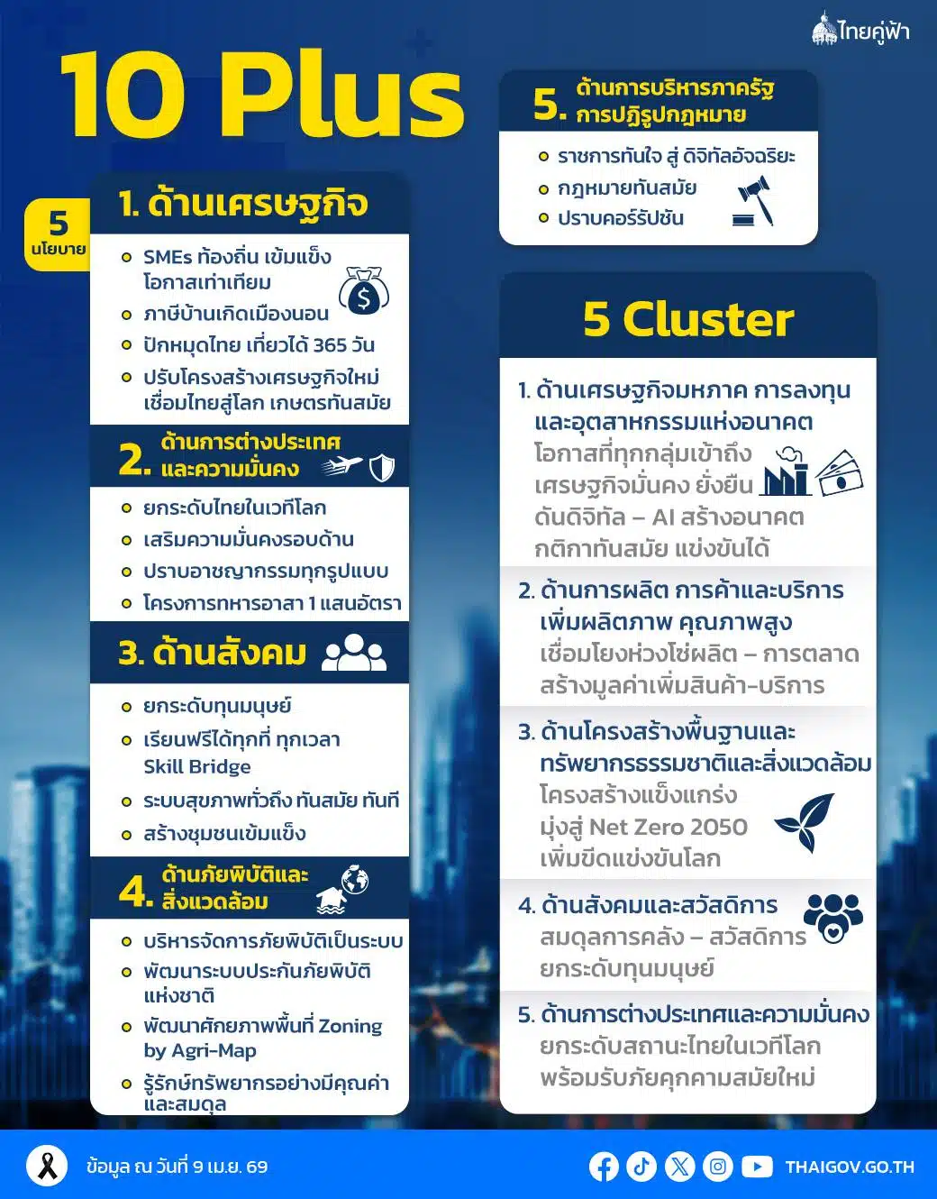 สรุปนโยบาย 10 Plus รัฐบาล “นายกฯ อนุทิน” แถลงต่อรัฐสภา ขับเคลื่อน 5 แนวนโยบายแห่งรัฐ และ 5 กลุ่มยุทธศาสตร์ คนไทยได้ประโยชน์อะไรบ้าง