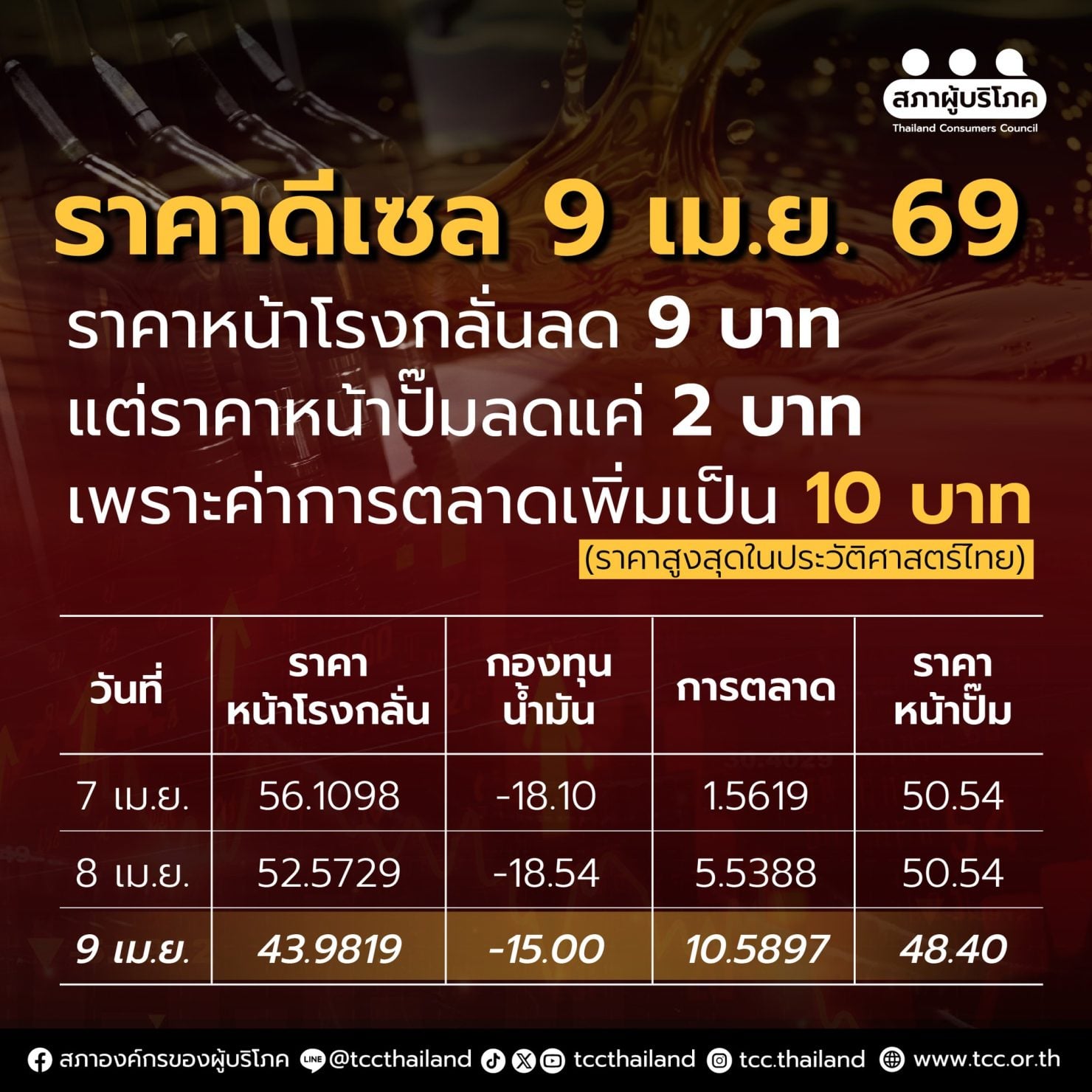 นายรุ่งชัย จันทสิงห์ คณะอนุกรรมการด้านบริการสาธารณะ พลังงาน สิ่งแวดล้อม สภาผู้บริโภค ให้ข้อมูลว่าราคาดีเซลหน้าโรงกลั่นลดลงถึง 9 บาทต่อลิตร ตามหลักการแล้วคนไทยควรได้เติมน้ำมันดีเซลในราคาประมาณ 42 บาทต่อลิตร ราคาหน้าปั๊มวันนี้กลับลดลงแค่ 2.14 บาทต่อลิตร ทำให้ราคาขายปลีกยังคงอยู่ที่ 48.40 บาทต่อลิตร