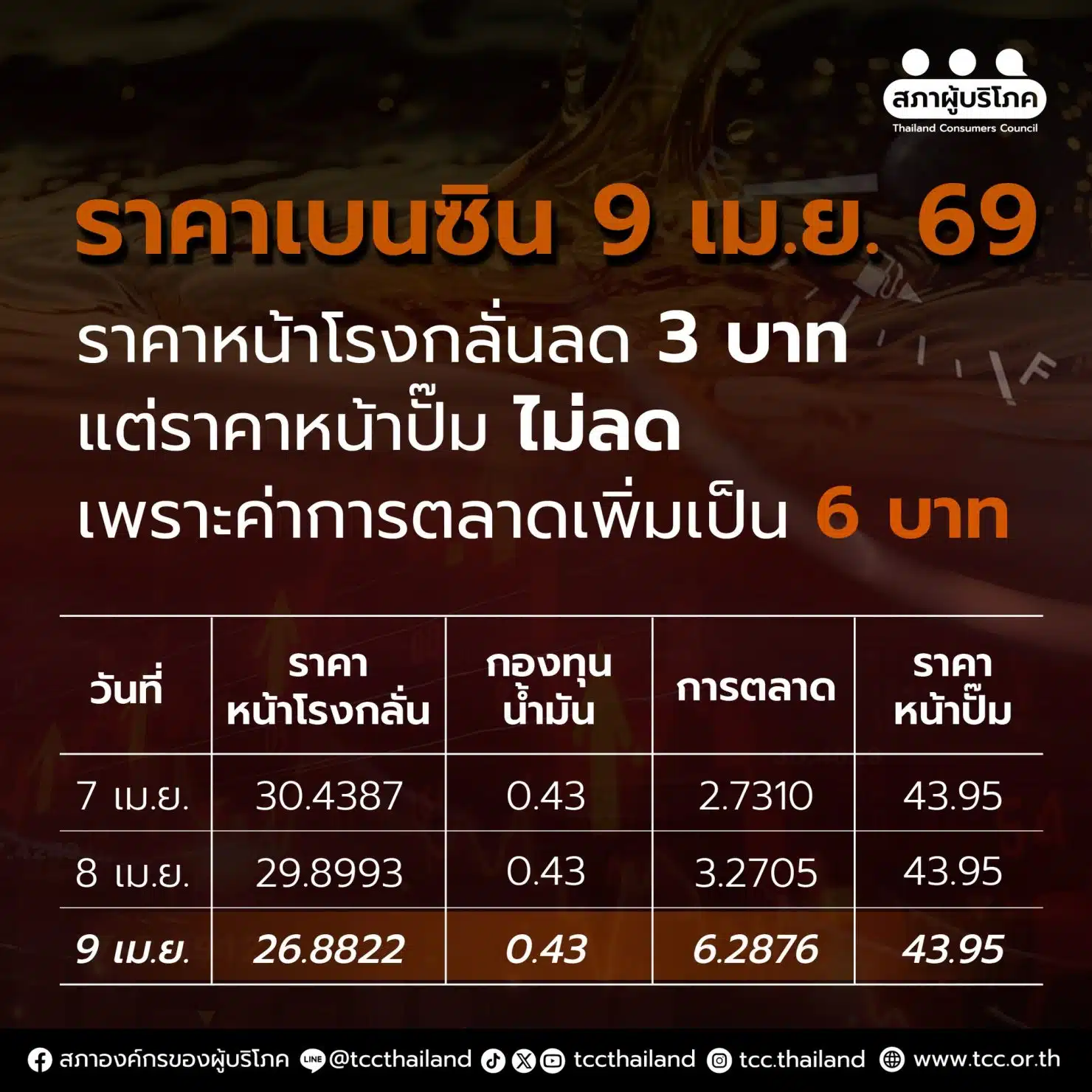 สภาผู้บริโภคเปิดข้อมูลราคาน้ำมันหน้าโรงกลั่นลดฮวบ แต่ปั๊มลดนิดเดียว เผยสาเหตุค่าการตลาดพุ่งปรี๊ด เรียกร้องถึงรัฐบาลเพื่อทวงคืนความเป็นธรรมให้คนใช้รถ