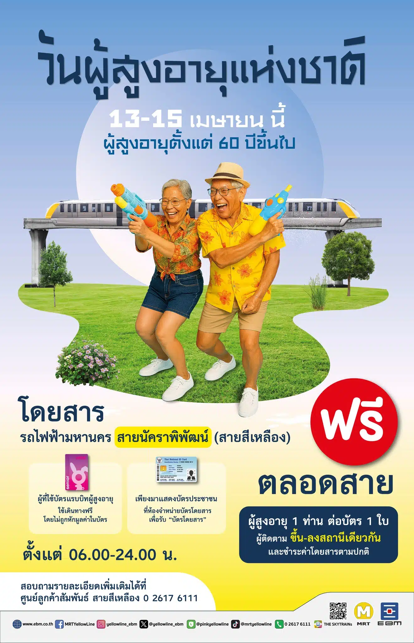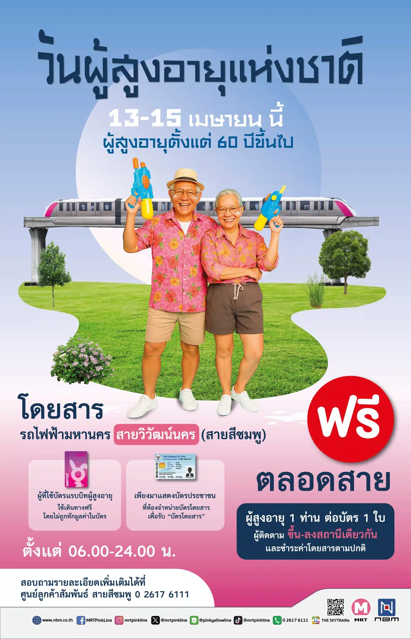 รฟม. จัดโปรสงกรานต์ ผู้สูงอายุ 60 ปีขึ้นไป นั่งรถไฟฟ้า MRT ฟรี 4 สาย “น้ำเงิน-ม่วง-เหลือง-ชมพู” 13-15 เม.ย.นี้ เช็กรายละเอียดที่นี่