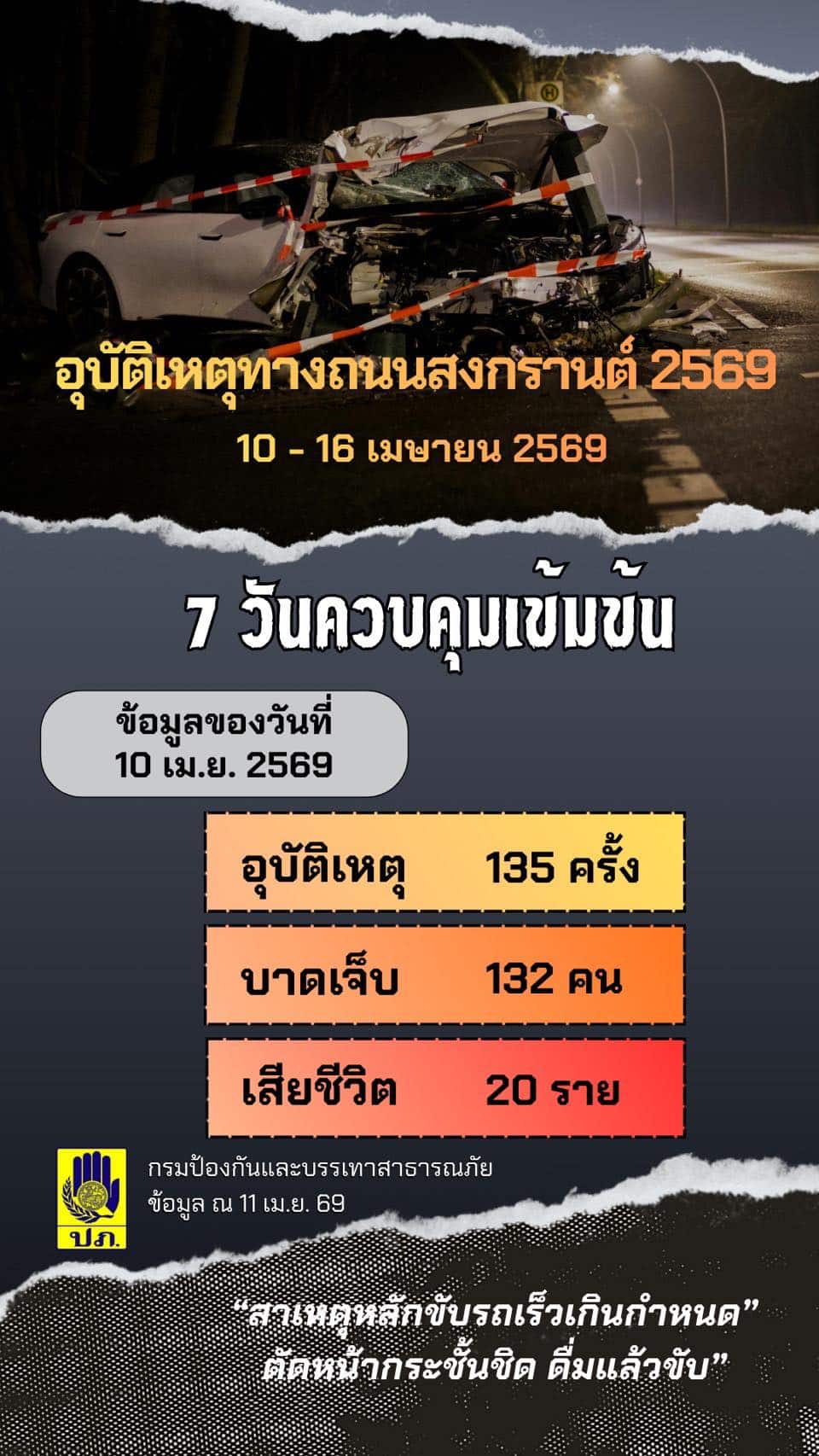 ศูนย์อำนวยการความปลอดภัยทางถนน (ศปถ.) กรมป้องกันและบรรเทาสาธารณภัย (ปภ.) แถลงข้อมูลอุบัติเหตุทางถนนช่วงเทศกาลสงกรานต์ ประจำวันที่ 10 เมษายน 2569 ซึ่งเป็นวันแรกของการรณรงค์ขับขี่ปลอดภัย