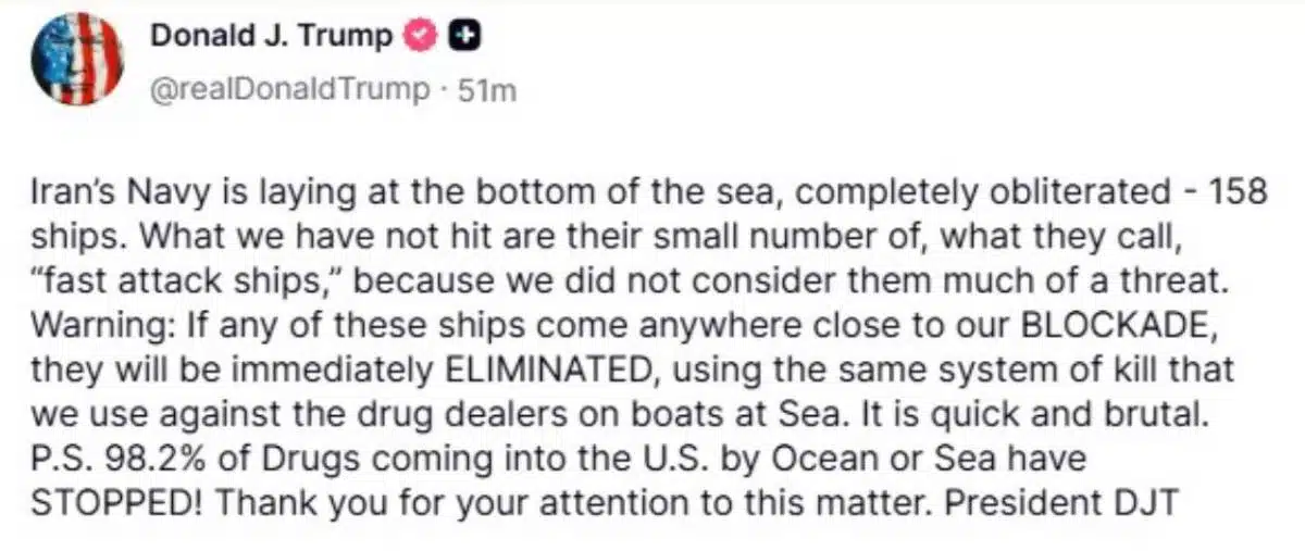 ทรัมป์ระบุว่า กองทัพสหรัฐฯ จัดการทำลายเรือรบของอิหร่านจนจมลงสู่ก้นทะเลไปแล้วจำนวน 158 ลำ ตอนนี้เป้าหมายที่ยังหลงเหลืออยู่คือ “เรือโจมตีความเร็วสูง” ซึ่งมีจำนวนไม่มากนัก ก่อนหน้านี้ทางการสหรัฐฯ มองว่าเรือกลุ่มนี้ไม่ใช่ภัยคุกคามหลักจึงยังไม่ได้เปิดฉากโจมตี