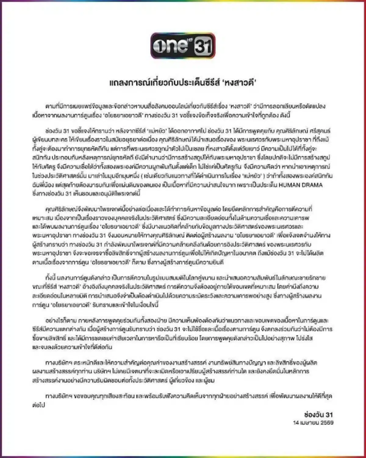 วันที่ 14 เม.ย. 2569 ช่องวัน 31 ออกแถลงการณ์ชี้แจงข้อเท็จจริง กรณีชาวเน็ตตั้งข้อสงสัยว่าโปรเจกต์ซีรีส์อิงประวัติศาสตร์เรื่องใหม่ ‘หงสาวดี’ คัดลอกเนื้อหามาจากการ์ตูนเรื่อง ‘อโยธยาเยาวดี’