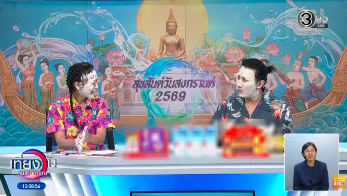 เป็นคนสุดท้ายที่หลายคนตั้งตารอ สำหรับ “หนุ่ม” กรรชัย กำเนิดพลอย ซึ่งถูกจัดหนักรุมละเลงปะแป้งกลางรายการเที่ยงวันทันเหตุการณ์ ท่ามกลางบรรยากาศในวันสงกรานต์ 2569 หลังเจอหมายหัวจาก สรยุทธ สุทัศนะจินดา มาตั้งแต่รายการกรรมกรข่าวคุยนอกจอ ซึ่งฝาก หมวย อริสรา มาเป็นตัวแทนหมู่บ้าน ประเดิมปะแป้งพิธีกรคนดังพร้อมกับอวยพรขอให้สุขภาพแข็งแรง ซึ่งเจ้าตัวถึงกับโอด อ่านข่าวไป แป้งเข้าปากไป