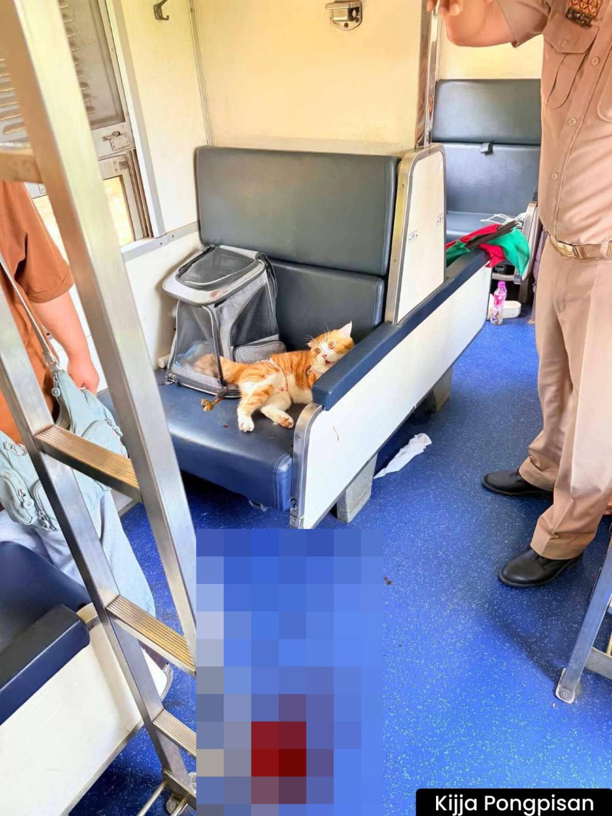เจ้าหน้าที่ 3 นายงัดผ้าปูเตียงสยบเหมียวคลั่งใช้เวลากว่า 20 นาที หลังแมวเกิดความเครียดเนื่องจากอากาศร้อน ไล่ข่วนผู้โดยสารบนขบวน 169 จนต้องจอดรถฉุกเฉิน