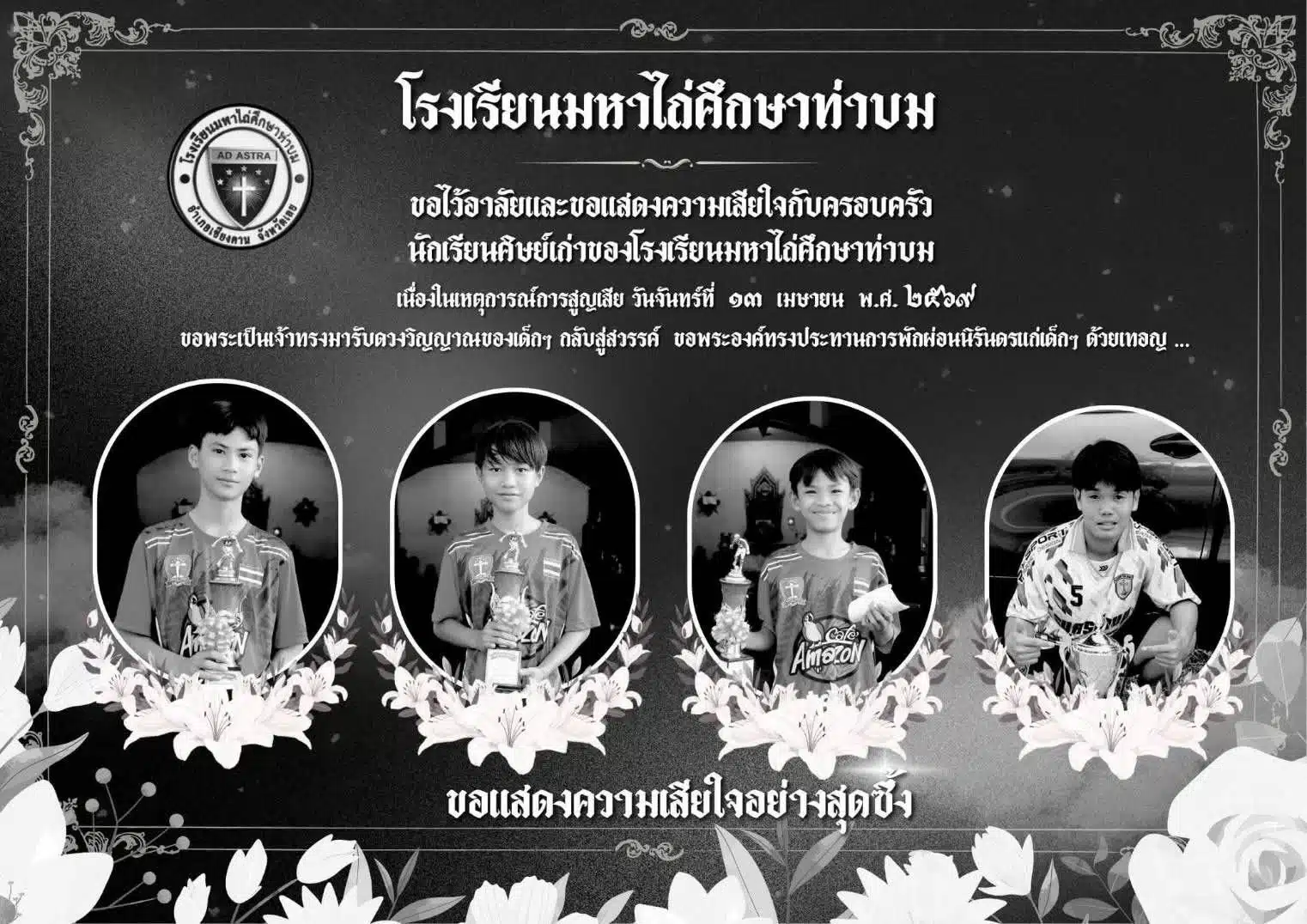 กรณีเด็กชาย 4 ชีวิตขี่รถจยย.ซ้อน 4 กลับจากเล่นน้ำสงกรานต์ที่เชียงคาน จ.เลย ถูกรถกระบะข้ามเลนชนจนเสียชีวิต 4 ราย ที่ถนนขาเข้า เลย-เชียงคาน บ้านนาบอน ต.นาซ่าว อ.เชียงคาน จ.เลย เป็นนักเรียนชั้น ม.1 และ ม.2 อดีตนักเรียนศิษย์เก่าและนักฟุตบอล โรงเรียนมหาไถ่ศึกษาท่าบม ต.เขาแก้ว อ.เชียงคาน จ.เลย