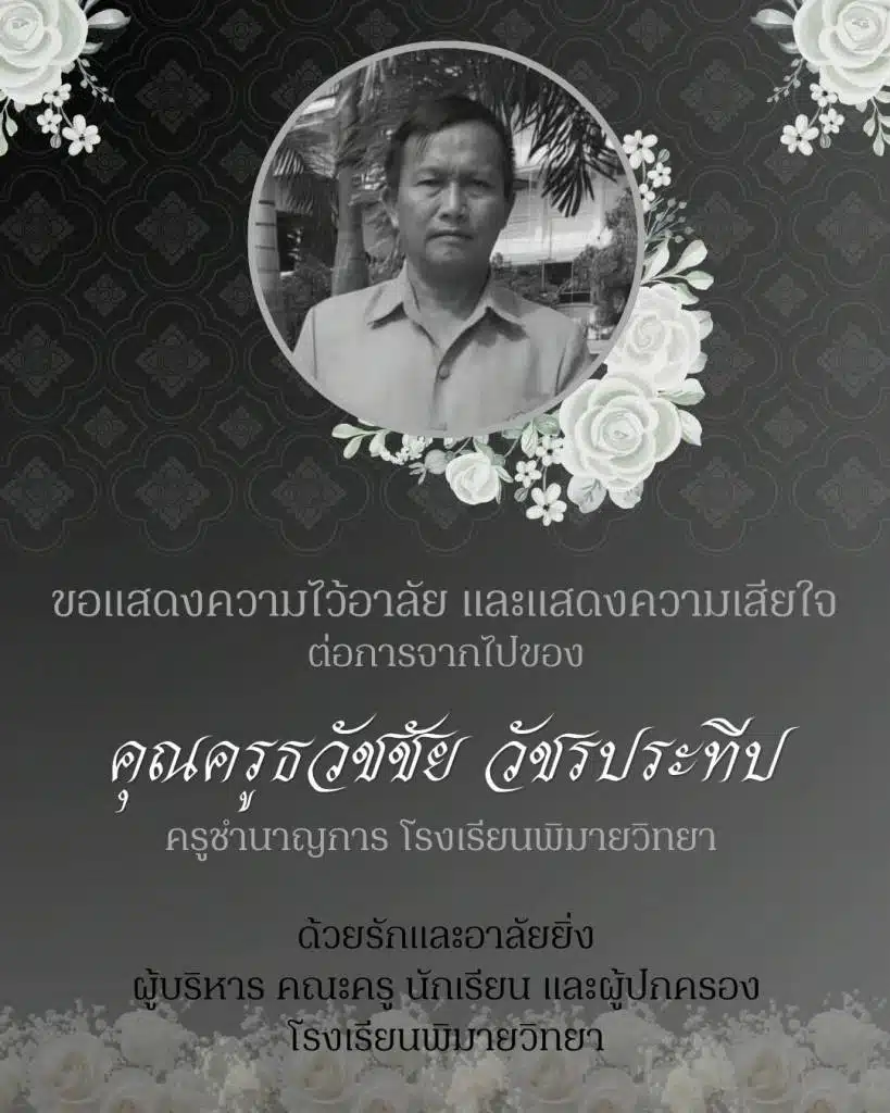 ตำรวจสภ.พิมาย เข้าตรวจสอบเหตุพบครูเสียชีวิตภายในบ้านพักครูโรงเรียนพิมายวิทยา จังหวัดนครราชสีมา เมื่อวันที่ 15 เมษายน 2569 บริเวณชั้นล่างของบ้าน พบร่างนายธวัชชัย อายุ 60 ปี ครูชำนาญการพิเศษกลุ่มสาระภาษาไทย นอนเสียชีวิตสภาพไม่สวมเสื้อ ตรวจสอบเบื้องต้นไม่พบร่องรอยการต่อสู้หรือทรัพย์สินสูญหาย คาดเสียชีวิตมาแล้วไม่ต่ำกว่า 10 ชั่วโมง