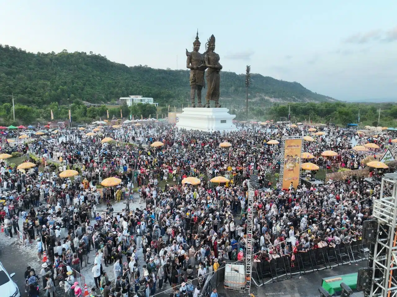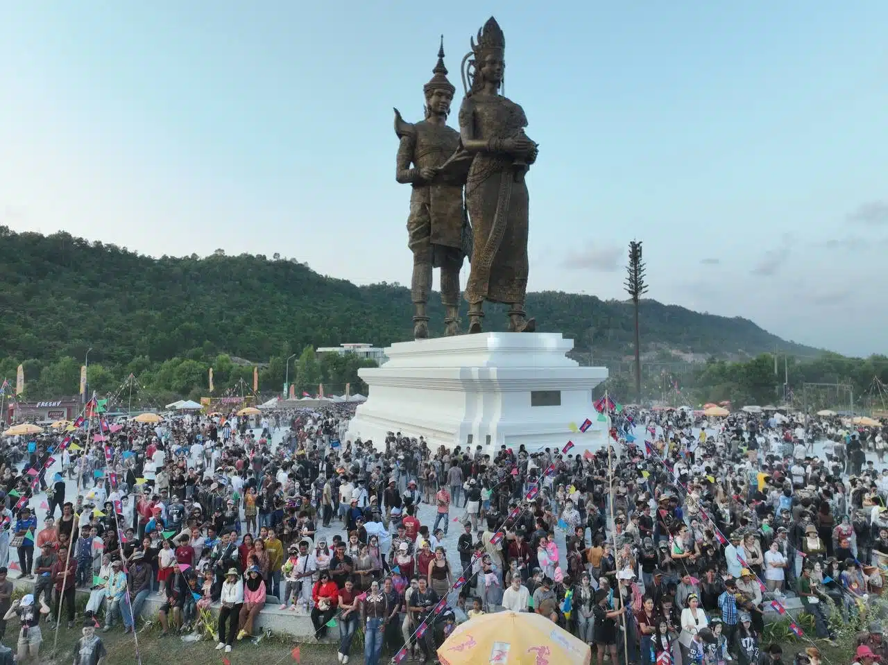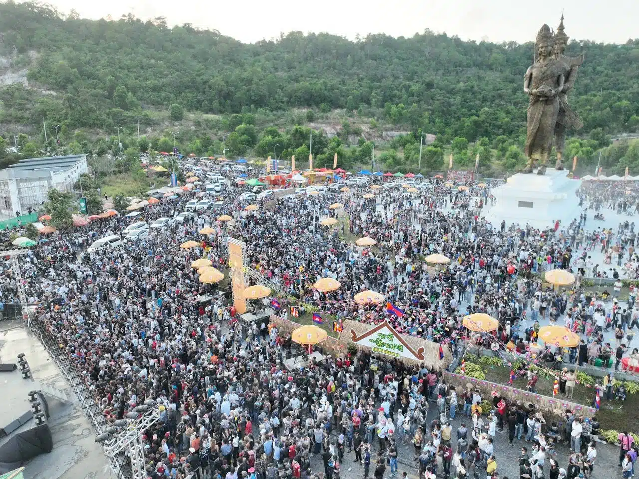 จากภาพแสดงให้เห็นคลื่นมหาชนหลั่งไหลเข้าร่วมงานเฉลิมฉลองเทศกาลปีใหม่อย่างเนืองแน่น พื้นที่จัดงานหลักอยู่บริเวณรอบวงเวียนอนุสาวรีย์พระทอง-นางนาค ซึ่งเป็นสถานที่สำคัญของจังหวัดพระสีหนุ การจัดงานดำเนินไปอย่างยิ่งใหญ่เพื่อต้อนรับนักท่องเที่ยวบริเวณด้านหน้าอนุสาวรีย์พระทอง-นางนาค มีการตั้งเวทีขนาดใหญ่สำหรับจัดการแสดง พื้นที่โดยรอบวงเวียนมีการตั้งซุ้มร้านค้าจำหน่ายสินค้าและอาหารจำนวนมาก