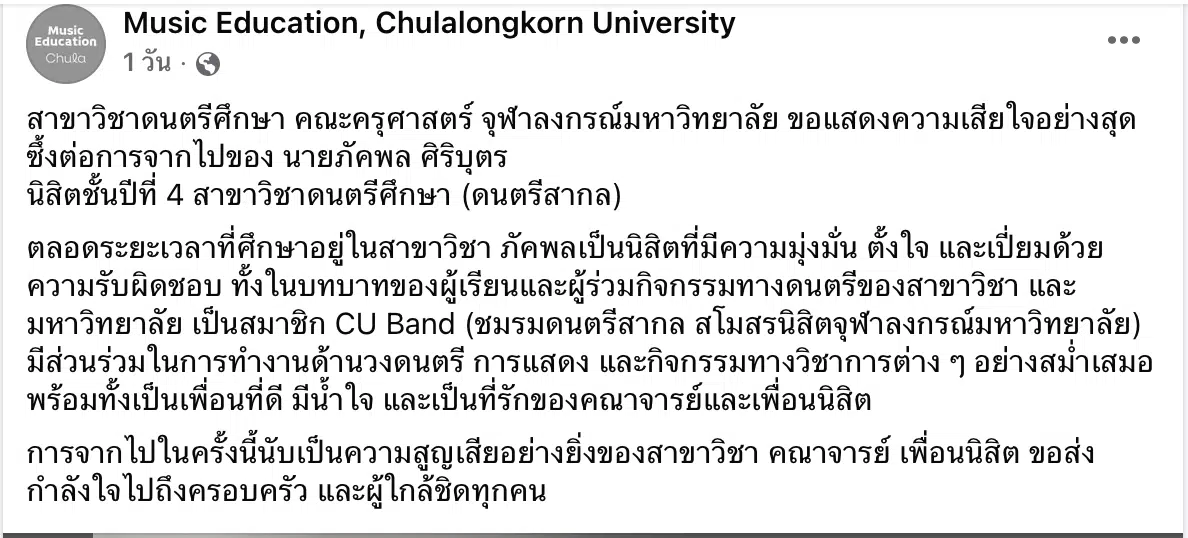 ล่าสุด สาขาวิชาดนตรีศึกษา คณะครุศาสตร์ จุฬาลงกรณ์มหาวิทยาลัย ออกแถลงการณ์เมื่อวันที่ 15 เมษายน 2569 คณาจารย์กับเพื่อนนิสิตต่างร่วมแสดงความเสียใจอย่างสุดซึ้ง แถลงการณ์ระบุว่านายภัคพลเป็นคนมีความมุ่งมั่น ตั้งใจ มีความรับผิดชอบสูงทั้งด้านการเรียนรวมถึงการทำกิจกรรมทางดนตรี เขาเป็นที่รักของทุกคน การสูญเสียครั้งนี้นับเป็นการสูญเสียบุคลากรคุณภาพของวงการดนตรี ทางสาขาวิชาส่งกำลังใจไปยังครอบครัวของผู้เสียชีวิตในช่วงเวลาแห่งความโศกเศร้า