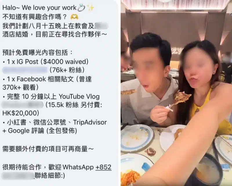 ตามรายงานจากสื่อ Feminine ระบุว่าอินฟลูเอนเซอร์รายนี้มียอดผู้ติดตามรวมกันประมาณ 70,000 คน จากหลายแพลตฟอร์มทั้ง Instagram, Threads และ Xiaohongshu เธอส่งข้อความไปหาทั้งช่างภาพ ร้านชุดเจ้าสาว และช่างแต่งหน้า เพื่อขอรับสปอนเซอร์สำหรับการจัดงานแต่งงานที่กำลังจะมาถึง