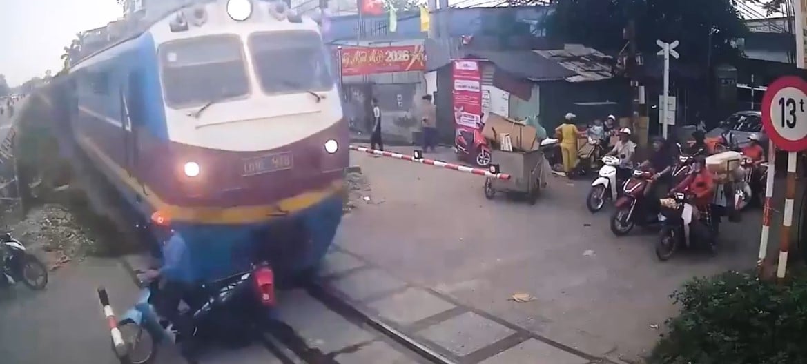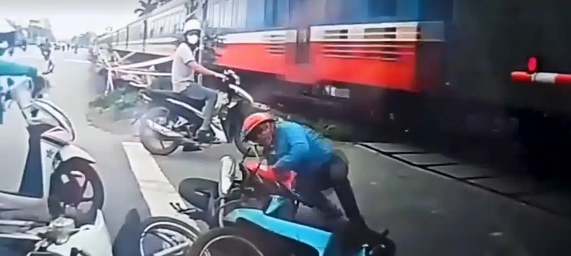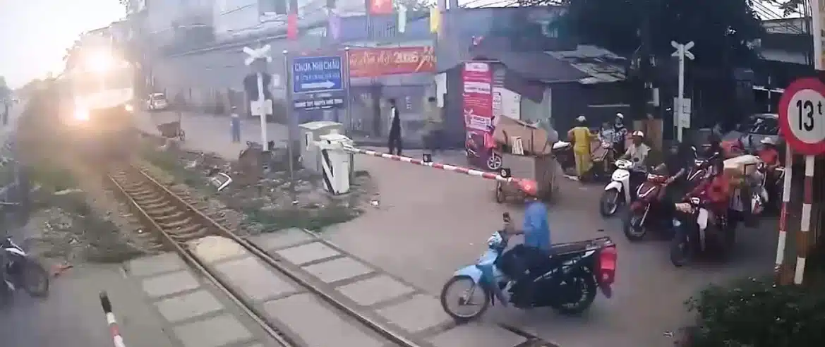 สำนักข่าวต่างประเทศ รายงานอุบัติเหตุที่ทำเอาคนเห็นคลิปหวาดเสียวไปตามกัน กรณีชายขี่รถจักรยานยนต์รายหนึ่งในกรุงฮานอย ประเทศเวียดนาม เมินไม้กั้นทางรถไฟที่ลดระดับลงมา ในขณะที่ผู้ใช้รถใช้ถนนคนอื่น ๆ จอดรออย่างเป็นระเบียบ แต่เขากลับขี่รถฝ่าออกไปโดยไม่กลัวสิ่งใด