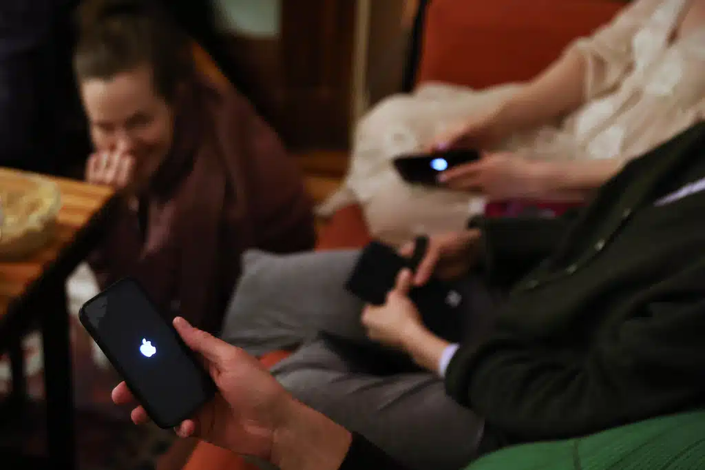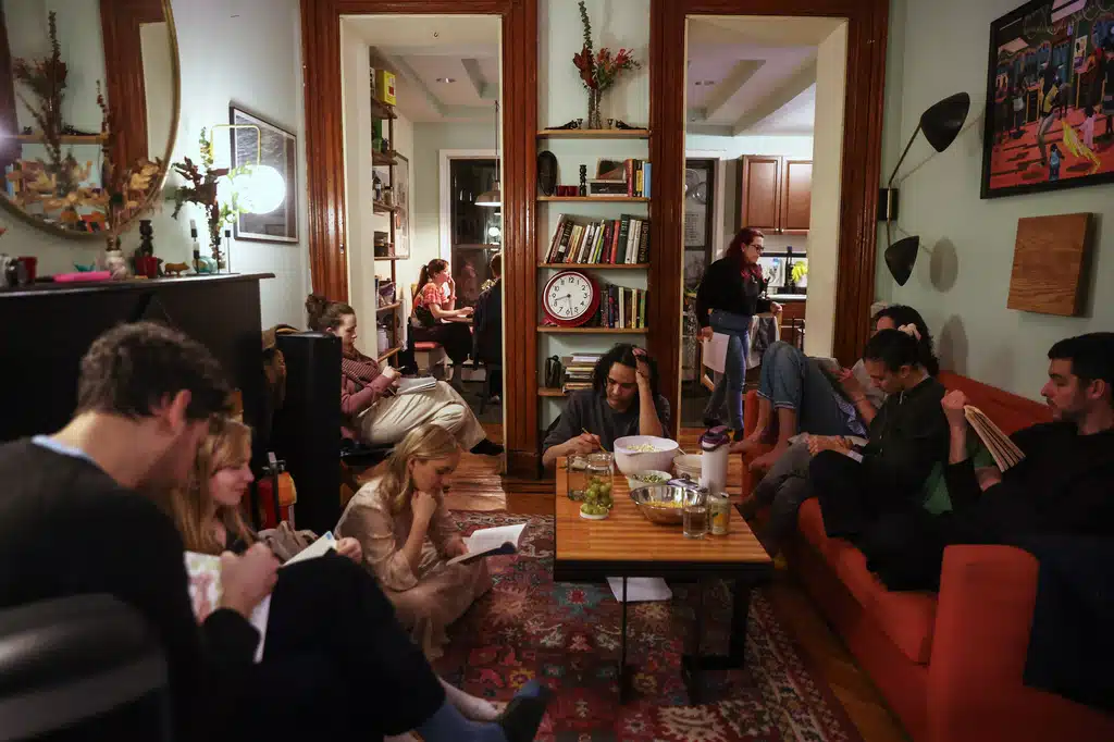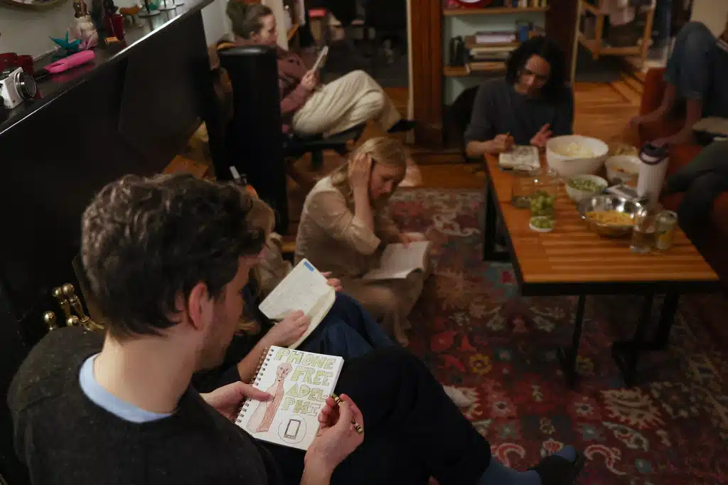 ในอพาร์ตเมนต์ย่านบรูคลิน นิวยอร์ก ภาพที่ปรากฏอาจดูแปลกตาสำหรับยุคดิจิทัล เมื่อกลุ่มคนรุ่นใหม่นำโทรศัพท์มือถือของพวกเขาไปวางรวมกันไว้ใน “กระชอนเหล็ก” ก่อนจะใช้เวลา 2 ชั่วโมงเต็ม ไปกับการอ่านหนังสือ วาดเขียน และพูดคุยสบตากัน โดยไม่มีแสงไฟจากหน้าจอมาขัดจังหวะ