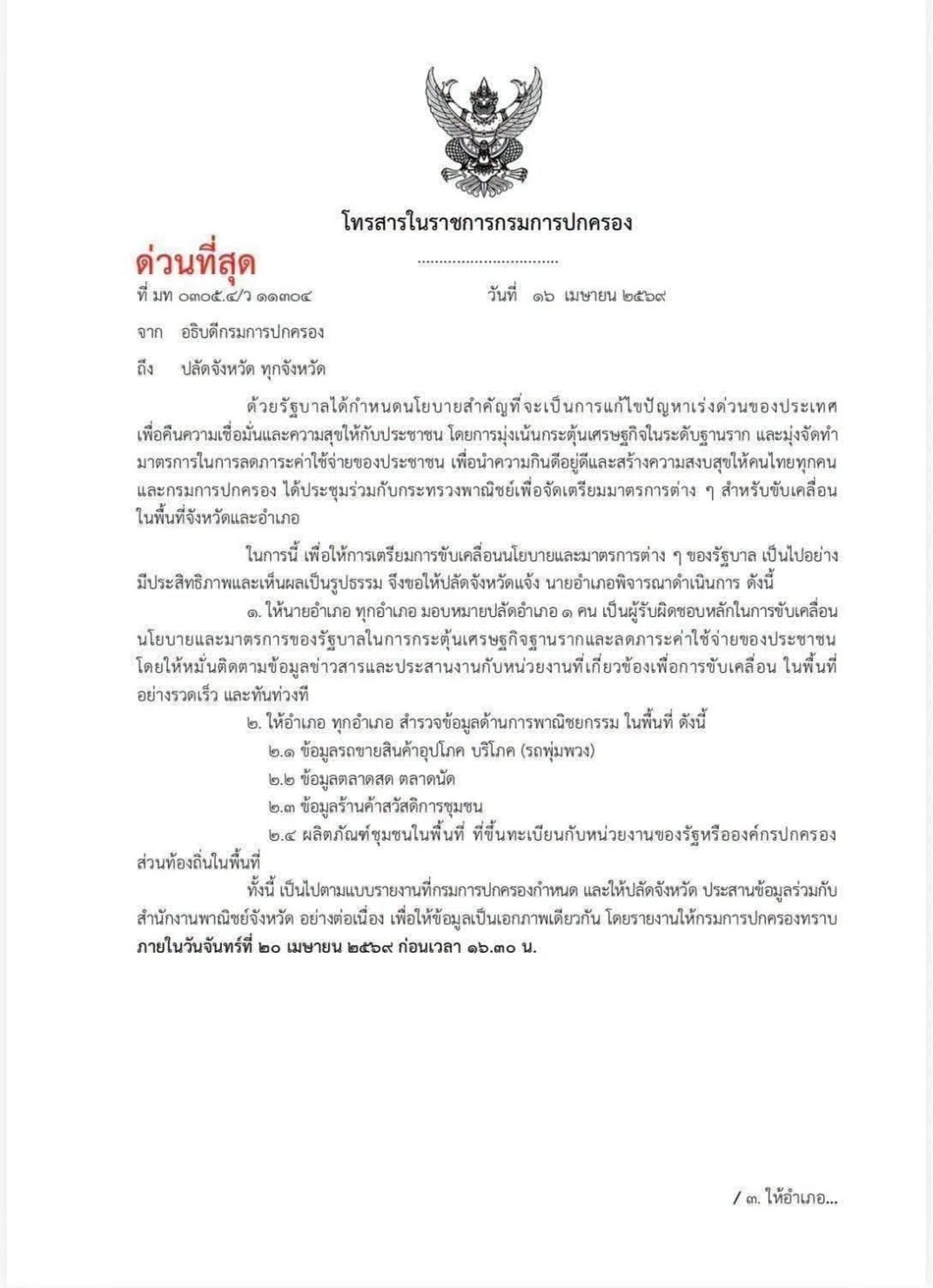 รัฐบาลเตรียมขยับตัวแก้ปัญหาเศรษฐกิจปากท้อง ล่าสุดอธิบดีกรมการปกครองออกหนังสือด่วนที่สุด สั่งการไปยังปลัดจังหวัดทั่วประเทศ ให้เร่งเตรียมความพร้อมรับมาตรการกระตุ้นเศรษฐกิจระดับฐานราก เป้าหมายเพื่อลดภาระค่าใช้จ่ายในชีวิตประจำวันของประชาชน