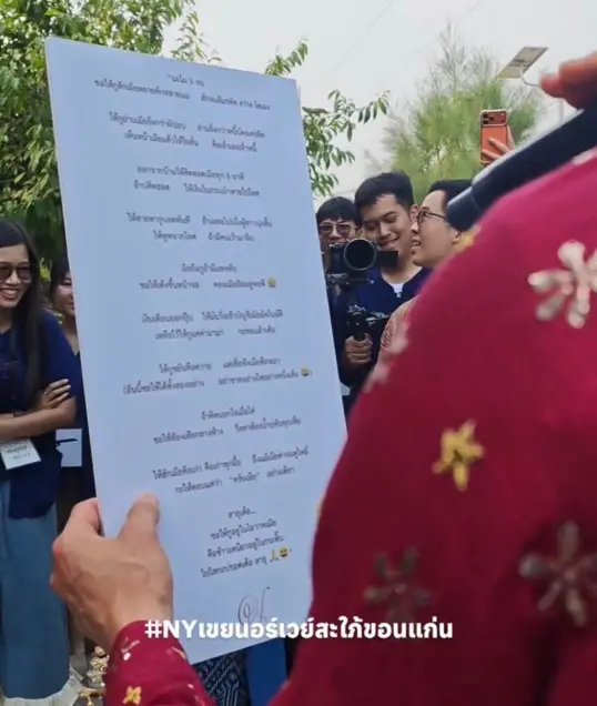 นอกจากความซึ้งจนครอบครัวน้ำตารื้นแล้ว ยังมีจังหวะเรียกเสียงเฮลั่นงานเมื่อเจ้าบ่าวประกาศคาถาบูชาเมียเป็นภาษาอีสาน ณเดชน์ให้คำมั่นสัญญาด้วยข้อความสุดฮาปนคลั่งรัก