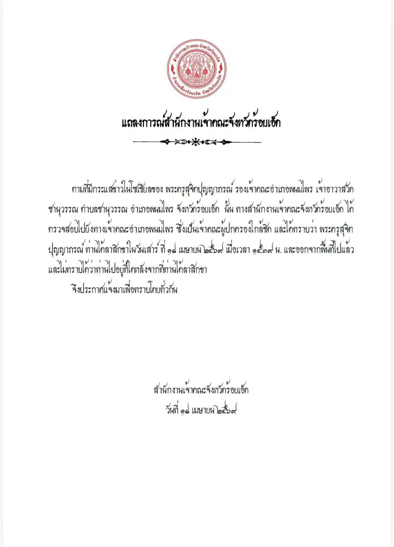 หลังจากเรื่องราวถูกแฉจนเป็นวงกว้าง สำนักงานเจ้าคณะจังหวัดร้อยเอ็ดตรวจสอบพบว่า พระครูรูปดังกล่าวได้ตัดสินใจ “ลาสิกขา” ทันทีเมื่อวันเสาร์ที่ 18 เมษายน 2569 เวลา 15.39 น. และรีบเดินทางออกจากพื้นที่ไปทันทีโดยไม่ทราบเบาะแสที่อยู่ปัจจุบัน