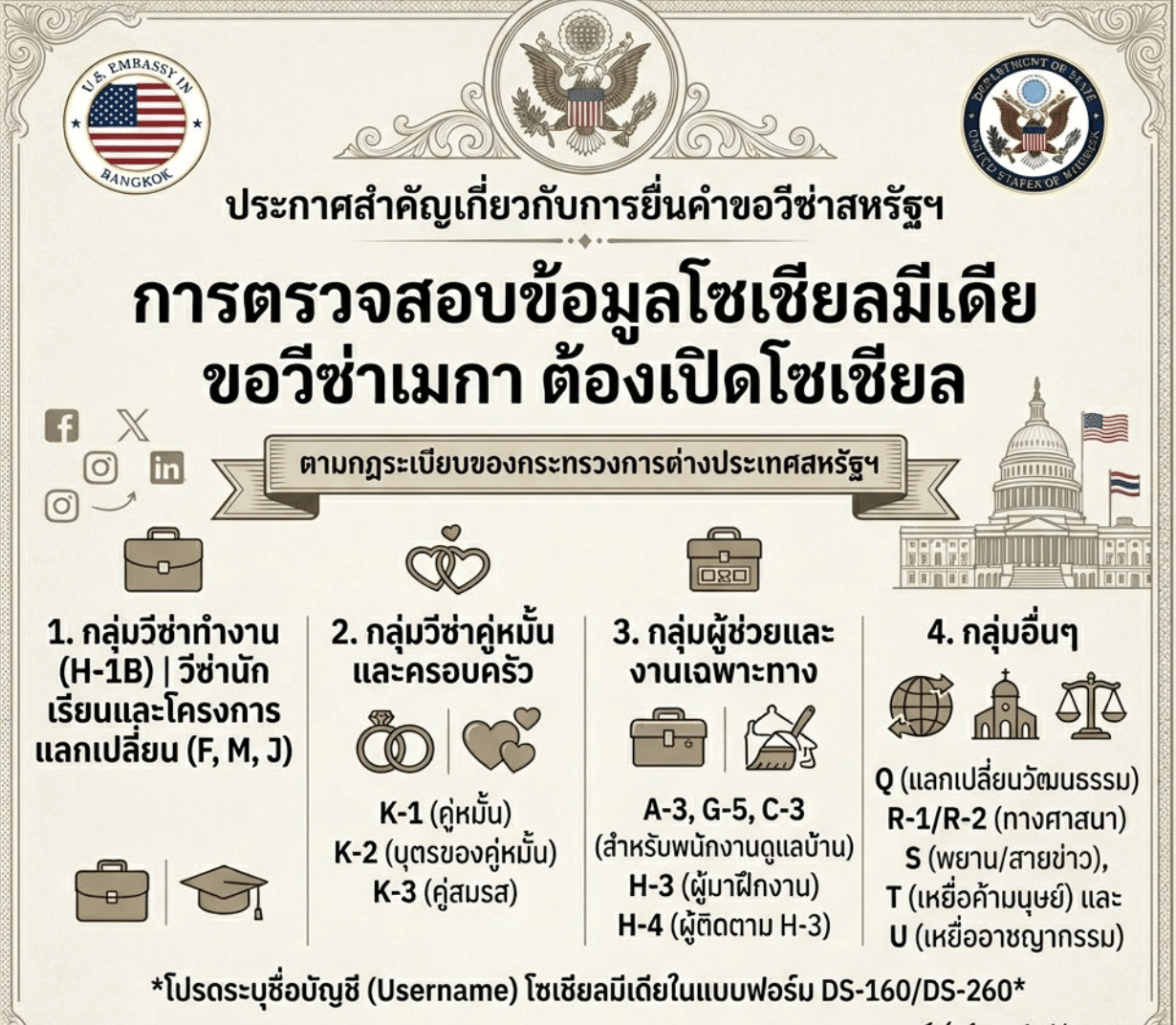 คนไทยยื่นวีซ่าอเมริกา ประเภทไหนบ้าง ต้องเปิดโซเชียลเป็นสาธารณะ