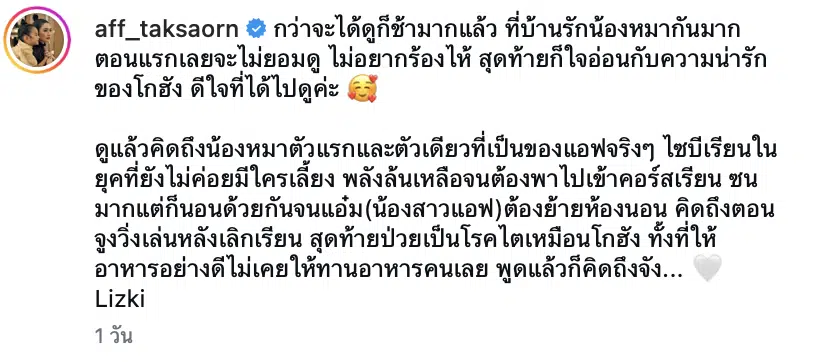 แอฟเล่าย้อนความทรงจำว่าในยุคนั้นคนยังไม่ค่อยนิยมเลี้ยงสุนัขพันธุ์ไซบีเรียนฮัสกี Lizki เป็นสุนัขที่มีพลังงานล้นเหลือจนต้องพาไปเข้าโรงเรียนฝึกสุนัข แม้จะซนมากแต่ก็ผูกพันกันถึงขั้นนอนร่วมเตียงเดียวกัน จนทำให้น้องสาวของแอฟต้องย้ายไปนอนห้องอื่น แอฟยังจำความรู้สึกตอนจูง Lizki วิ่งเล่นหลังเลิกเรียนได้เป็นอย่างดี