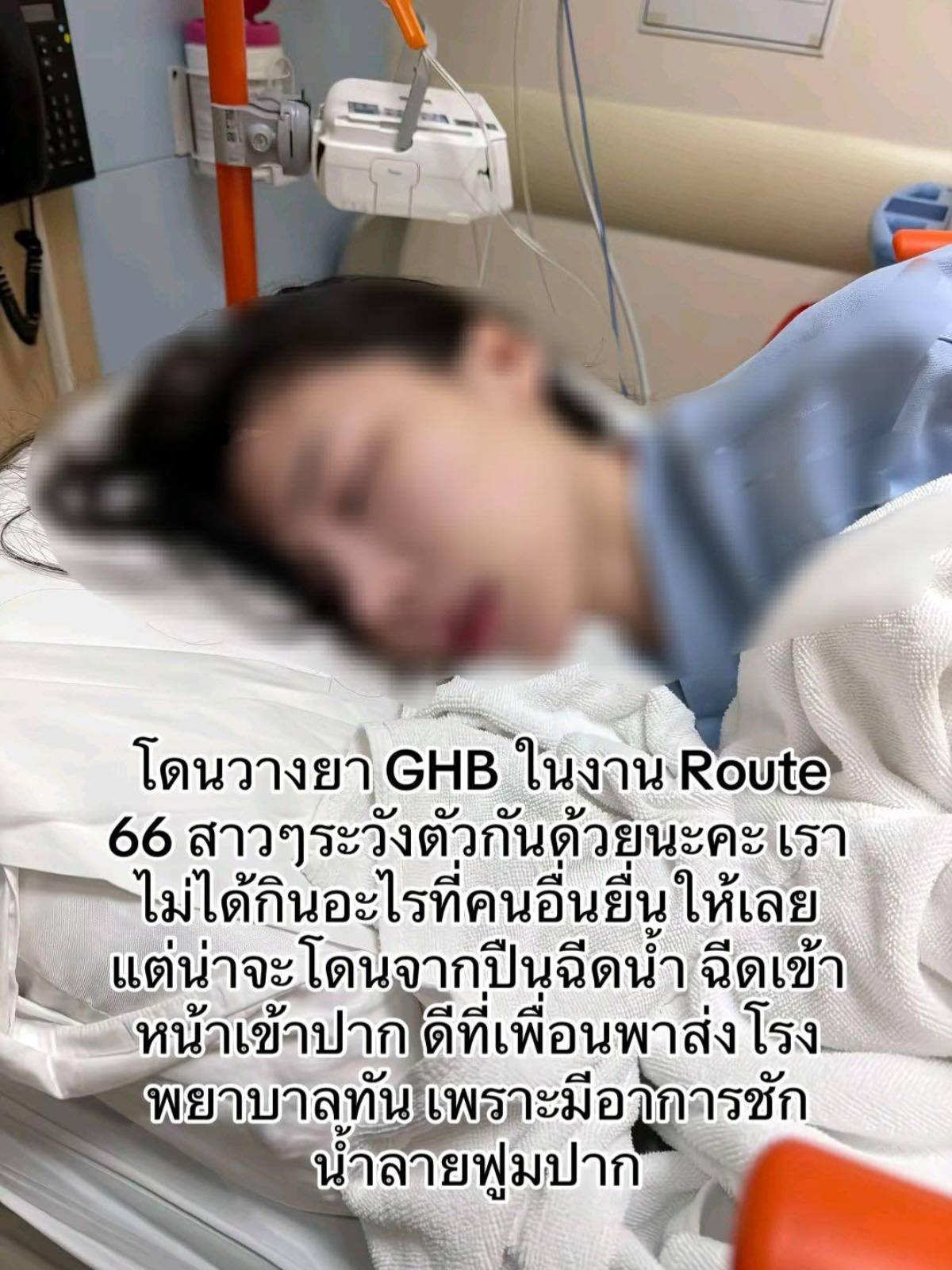 โดยเรื่องราวดังกล่าวเริ่มจากผู้ใช้บัญชีติ๊กตอก ชื่อ คุณจิ๊บ @Jeeeppji โพสต์ข้อความเมื่อ 14 เม.ย.ว่า “โดนวางยา GHB ในงาน Route 66 สาวๆ ระวังตัวกันด้วยนะคะ เราไม่ได้กินอะไรที่คนอื่นยื่นให้เลย แต่น่าจะโดนจากปืนฉีดน้ำ ฉีดเข้าหน้าเข้าปาก ดีที่เพื่อนพาส่งรพ.ทัน เพราะมีอาการชัก น้ำลายฟูมปาก”