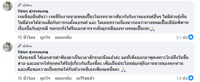 เจนนี่อธิบายรายละเอียดเพิ่มเติมว่า ตนรับงานเรตราคาปกติเหมือนแบรนด์อื่น ไม่มีส่วนรู้เห็นเกี่ยวกับการก่อตั้งแบรนด์ขนมเปี๊ยะ ไม่เคยทราบเรื่องข้อพิพาทชื่อแบรนด์มาก่อนจนกระทั่งได้รับเอกสารฟ้องร้อง