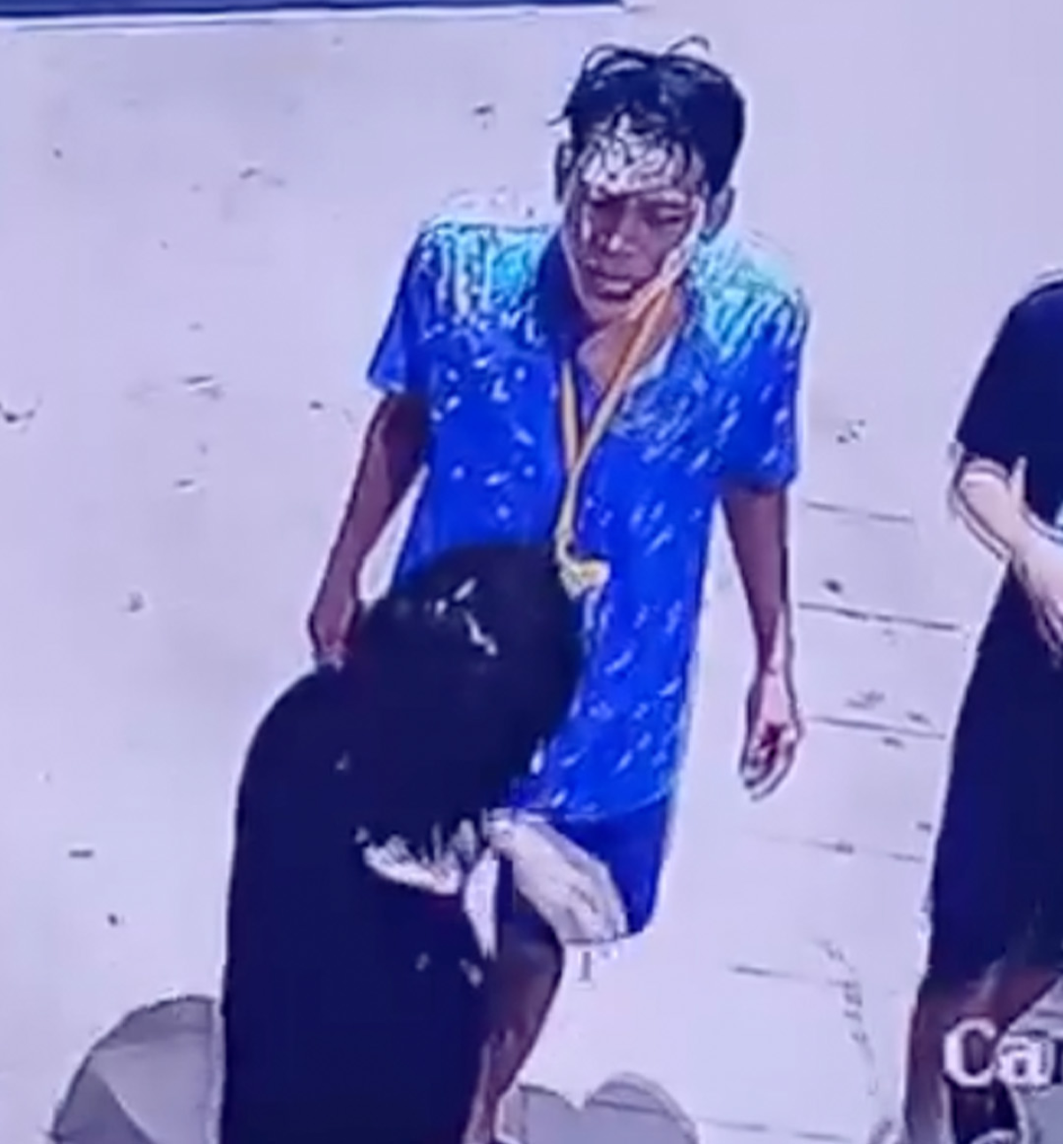 จากนั้นยืนเผชิญหน้ากันและดูเหมือนกำลังโต้เถียงกันอย่างรุนแรงกับหนุ่มเสื้อดำ โดยชายเสื้อน้ำเงินมีท่าทีฉุนเฉียวและมีการใช้มือทำร้ายอีกฝ่าย