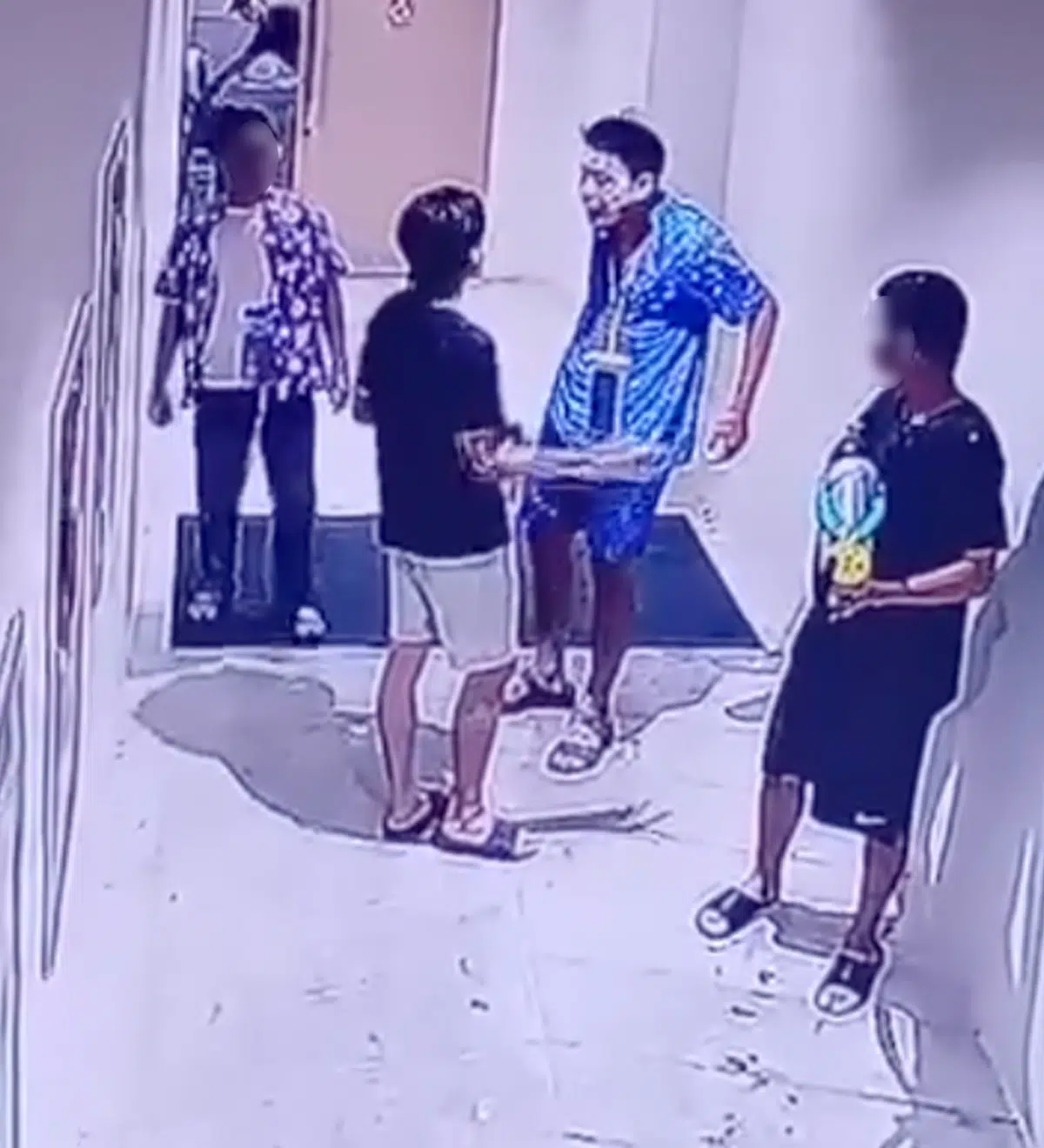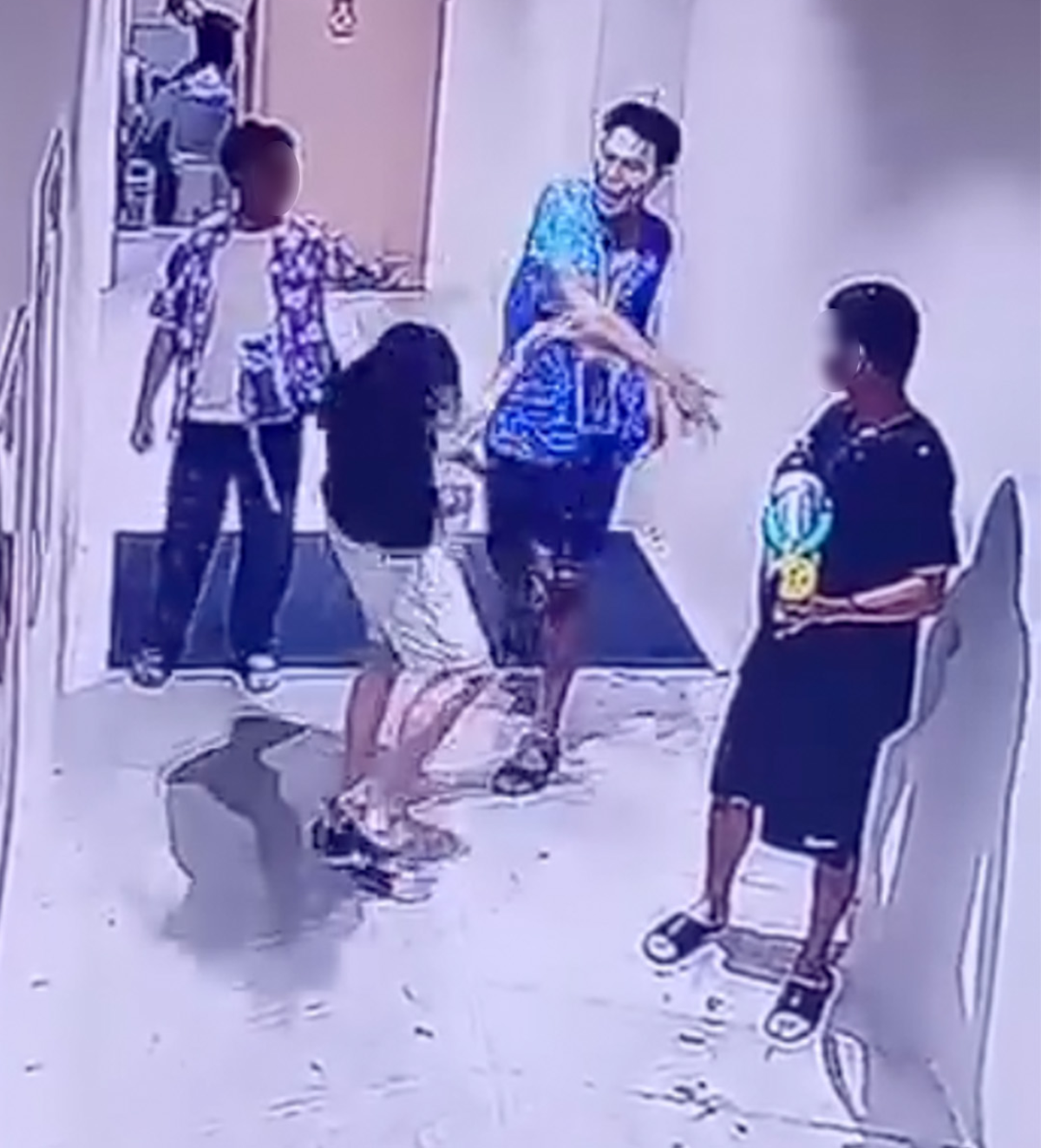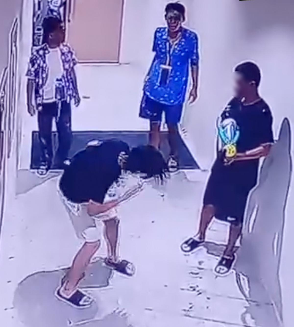 ทั้งนี้ในคลิปเป็นเหตุการณ์ที่บันทึกจากกล้องวงจรปิดในอาคารแห่งหนึ่ง มีชายวัยรุ่นกลุ่ม3 คน สวมชุดลำลองและเสื้อลายดอก เดินหน้าห้องน้ำ และมีชายเสื้อน้ำเงิน เดิมตามมาด้วยท่าทางกร่าง