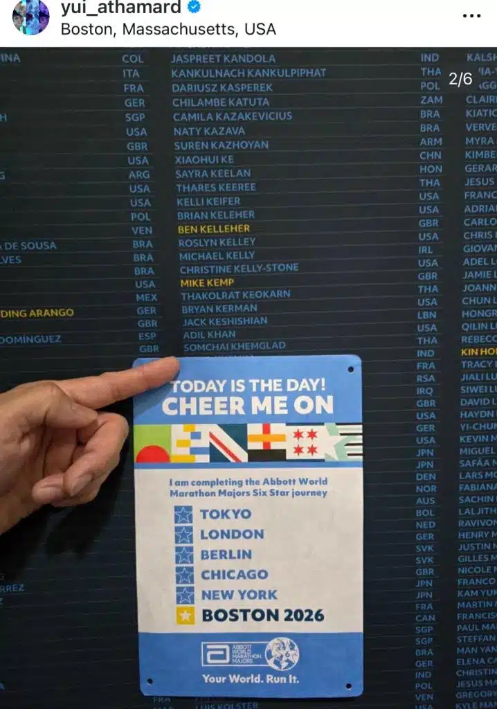 ยุ้ย อัฐมาศ โพสต์ข้อความชวนแฟนคลับร่วมส่งกำลังใจให้สามีในช่วงการวิ่งสนามสุดท้ายที่บอสตัน เล่าว่าเต๋าเริ่มเก็บดาวดวงแรกที่นิวยอร์กเมื่อปี 2019 เขาฝ่าฟันอุปสรรคมากมายรวมถึงช่วงวิกฤตโควิด-19 จนกระทั่งเดินทางมาถึงสนามที่ 6 ในปีนี้
