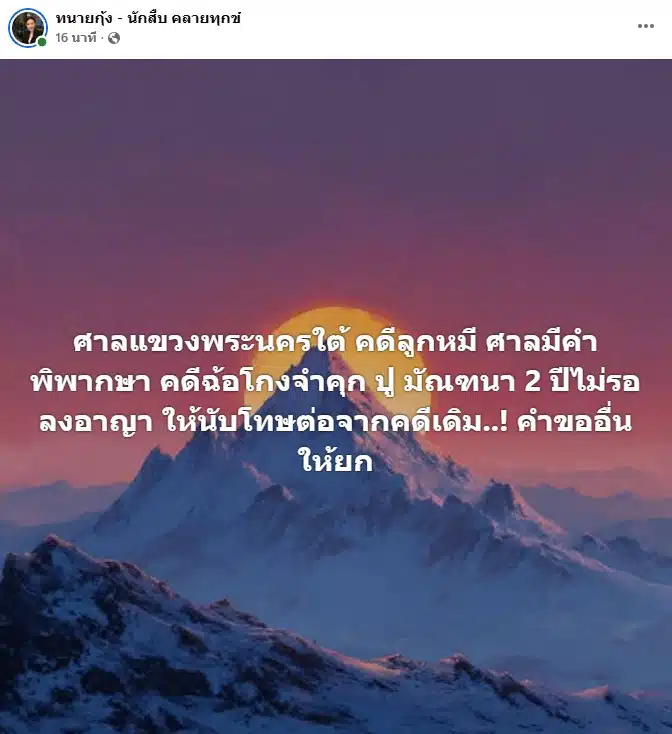 ขณะที่ทนายกุ้ง อำนวยพร มณีวรรณ์ โพสต์ข้อความผ่านเพจ ทนายกุ้ง – นักสืบ คลายทุกข์ ด้วยเช่นกันว่า “ศาลแขวงพระนครใต้ คดีลูกหมี ศาลมีคำพิพากษา คดีฉ้อโกงจำคุก ปู มัณฑนา 2 ปีไม่รอลงอาญา ให้นับโทษต่อจากคดีเดิม..! คำขออื่นให้ยก”