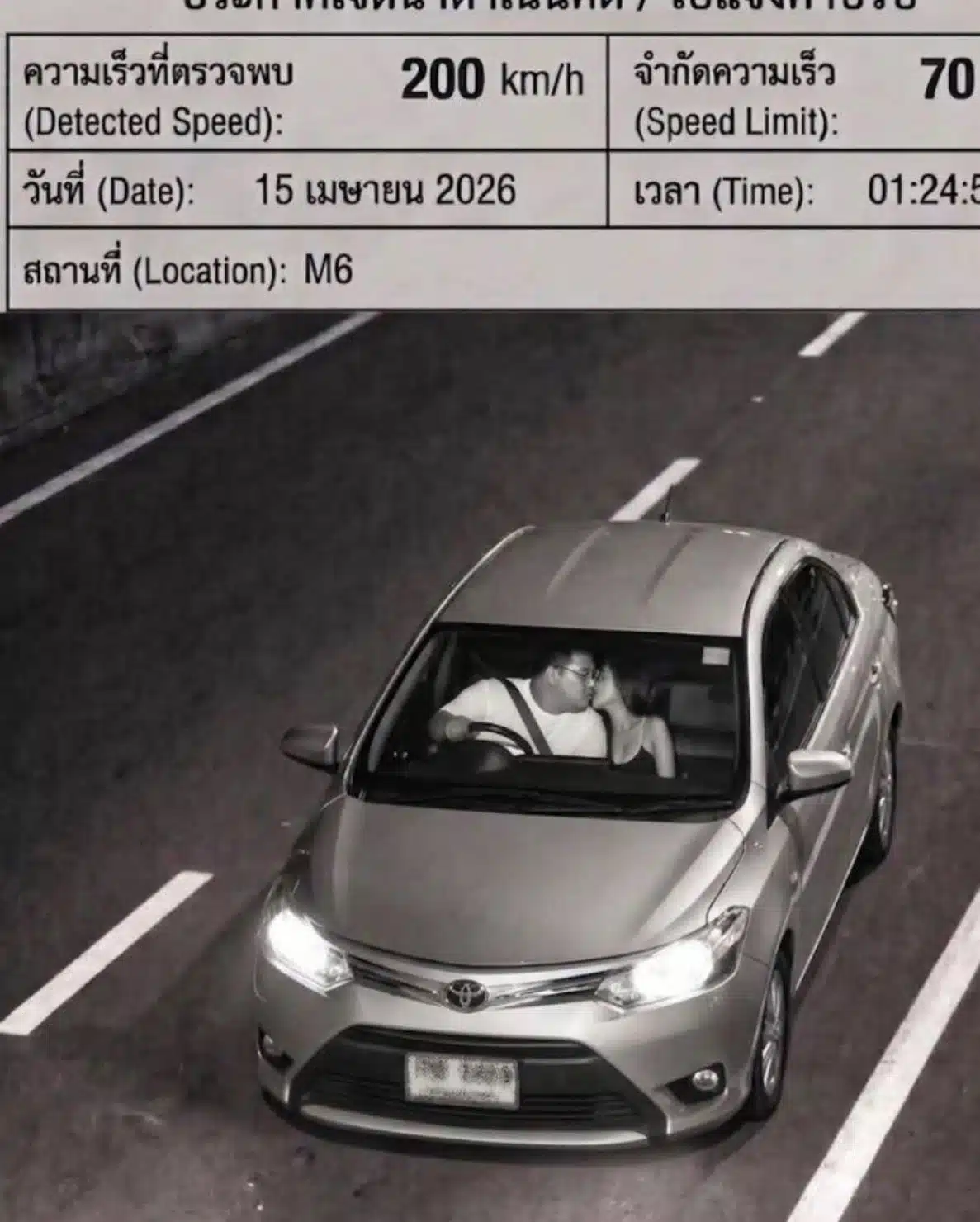 จุดสนใจของภาพไม่ได้มีแค่เรื่องขับรถเร็วเกินกำหนด ผู้คนบนโลกออนไลน์ต่างโฟกัสไปที่พฤติกรรมของคนขับรถ ภาพจากกล้องแสดงให้เห็นชายคนขับกำลังก้มลงจูบผู้หญิงที่นั่งอยู่เบาะข้างคนขับ