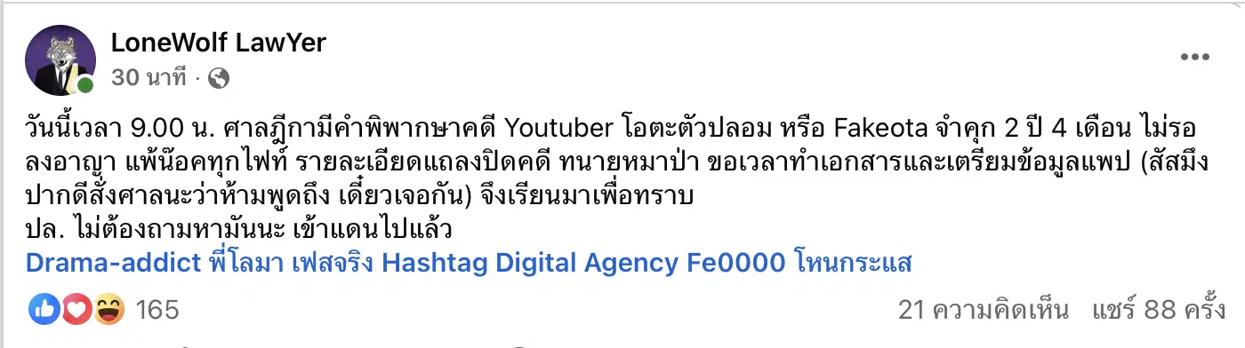 เพจเฟซบุ๊ก LoneWolf LawYer หรือ ทนายหมาป่า โพสต์ข้อความแจ้งความคืบหน้าคดีความของยูทูบเบอร์ช่อง Fakeota หรือ โอตะตัวปลอม ศาลฎีกามีคำพิพากษาคดีนี้ในเวลา 09.00 น. ของวันนี้ ศาลตัดสินจำคุกโอตะตัวปลอมเป็นเวลา 2 ปี 4 เดือน ศาลสั่งลงโทษจำคุกทันทีโดยไม่มีการรอลงอาญา