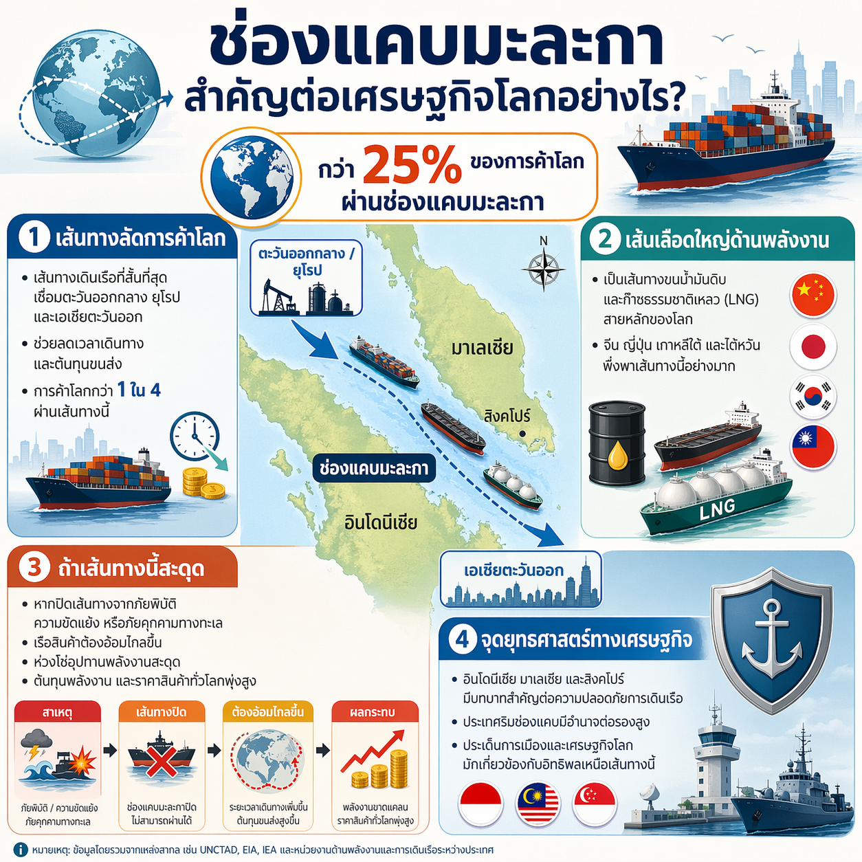 ช่องแคบมะละกาคือเส้นทางเดินเรือทางทะเลที่สั้นที่สุดสำหรับการเดินทางเชื่อมต่อระหว่างภูมิภาคตะวันออกกลาง ทวีปยุโรป กับทวีปเอเชียตะวันออก ความได้เปรียบเรื่องระยะทางช่วยลดต้นทุนการขนส่งสินค้าพร้อมกับประหยัดเวลาเดินทางได้อย่างมหาศาล ปัจจุบันปริมาณการค้าโลกกว่า 1 ใน 4 เดินทางผ่านเส้นทางนี้ สินค้าอุปโภคบริโภค วัตถุดิบอุตสาหกรรม ชิ้นส่วนอิเล็กทรอนิกส์ ล้วนพึ่งพาน่านน้ำแห่งนี้เพื่อกระจายสินค้าสู่ตลาดโลก
