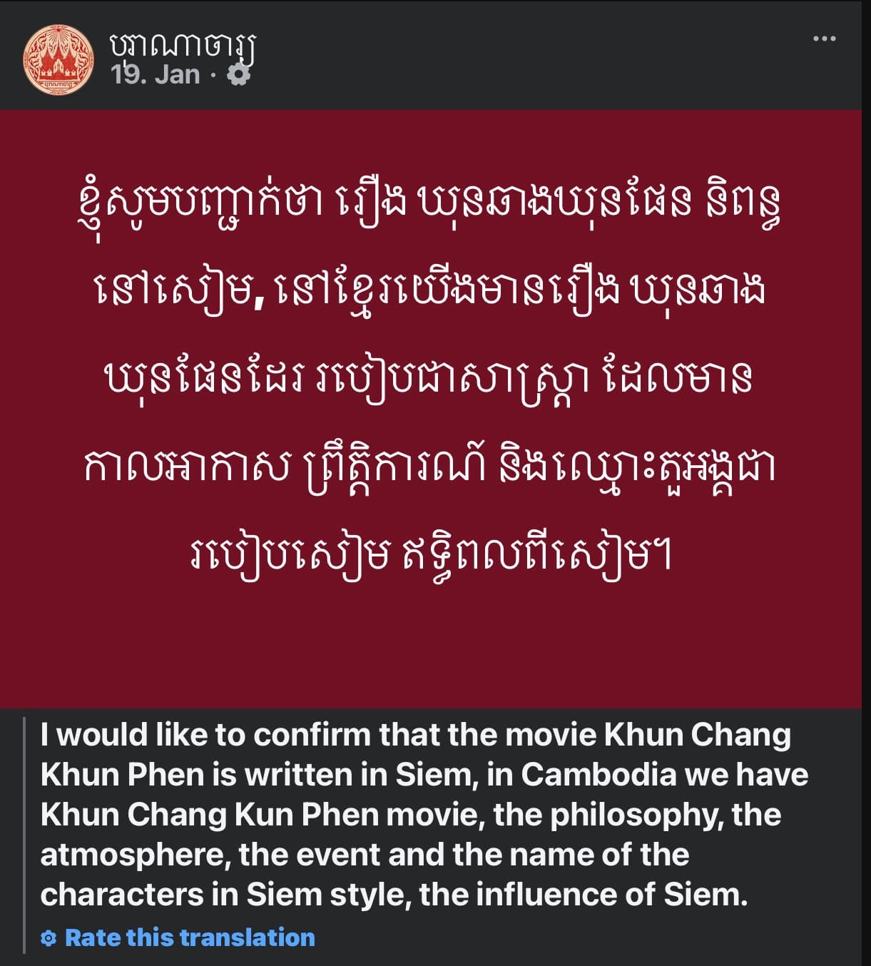 กลายเป็นประเด็นเดือดอีกครั้ง หลังเพจเฟซบุ๊ก Lertler Verwang แชร์ว่า นักร้องชาวกัมพูชา ทำคลิปคอนเฟิร์มว่าวรรณกรรมเรื่อง ขุนช้างขุนแผน ของประเทศไทย ฝั่งเขมรได้นำมาทำละครและภาพยนตร์ตามแบบฉบับของตนเอง ทั้งเรื่องปรัชญา บรรยากาศ เหตุการณ์ และชื่อตัวละครซึ่งตัวเนื้อเรื่องมาจากไทย เป็นการได้รับอิทธิจากไทยโดยตรง