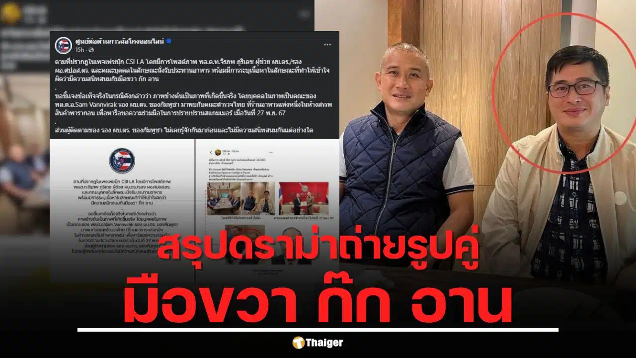 โซเชียลเดือดปุดๆ หลังเพจดังปล่อยภาพผู้บัญชาการตำรวจสอบสวนกลางร่วมโต๊ะกับคนสนิท “ก๊ก อาน” ผู้ทรงอิทธิพลชาวกัมพูชา ล่าสุดศูนย์ปราบโกงออนไลน์แจงยิบ เป็นภาพคุยงานราชการ ไม่ได้สังสรรค์ส่วนตัว