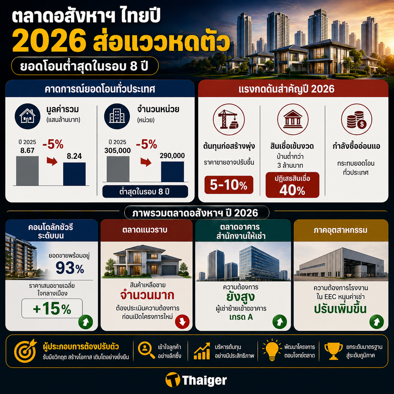 ศูนย์วิจัยของธนาคารไทยพาณิชย์ประเมินตลาดอสังหาริมทรัพย์ไทยปี 2026 อยู่ในสภาวะหดตัว ยอดโอนกรรมสิทธิ์ที่อยู่อาศัยทั่วประเทศมีแนวโน้มลดลง 5 เปอร์เซ็นต์เมื่อเทียบกับปีก่อนหน้า มูลค่ารวมอาจเหลือเพียง 8.24 แสนล้านบาท ธนาคารเกียรตินาคินภัทรคาดการณ์ตัวเลขยอดโอนทั่วประเทศจะลดลงเหลือ 290,000 หน่วย นับเป็นสถิติต่ำสุดในรอบ 8 ปี