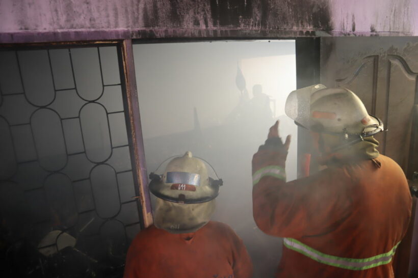 เบื้องต้นในจุดเกิดเหตุซึ่งเป็นห้องพระ ชั้น 1 อยู่ด้านในสุดของหอพัก พบมีเปลวไฟลุกไหม้และมีควันพวยพุ่งออกมาจากห้องเป็นจำนวนมาก เจ้าหน้าที่ได้ฉีดน้ำสกัดทั้งภายในและโดยรอบเพื่อไม่ให้เพลิงลุกลาม โดยใช้เวลาประมาณ 15 นาที ทำให้เปลวไฟมอดดับลง และกลุ่มควันเบาบางลง จึงฉีดน้ำเลี้ยงต่อเนื่องจนกระทั่งกลุ่มควันจางหายไป